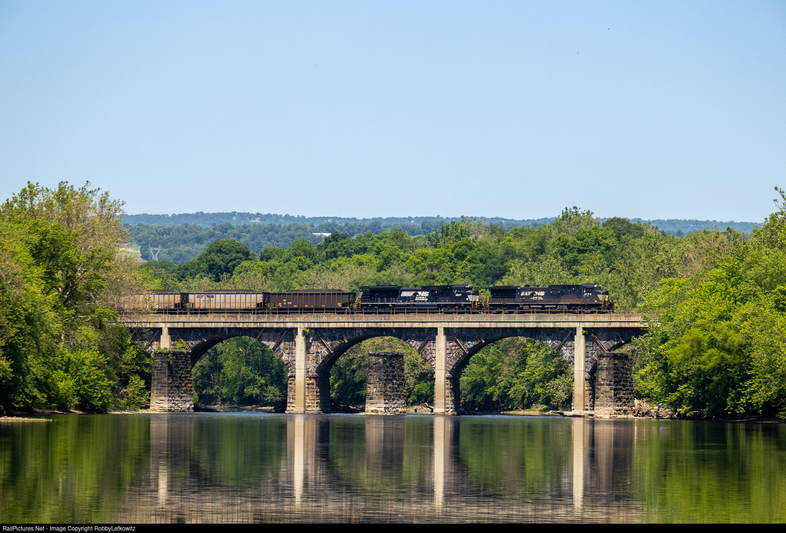 NS 4174 leads doubled up loaded coal train NS 594 over the Juniata River in Lewistown, PA, as the train continues its journey toward Harrisburg. |