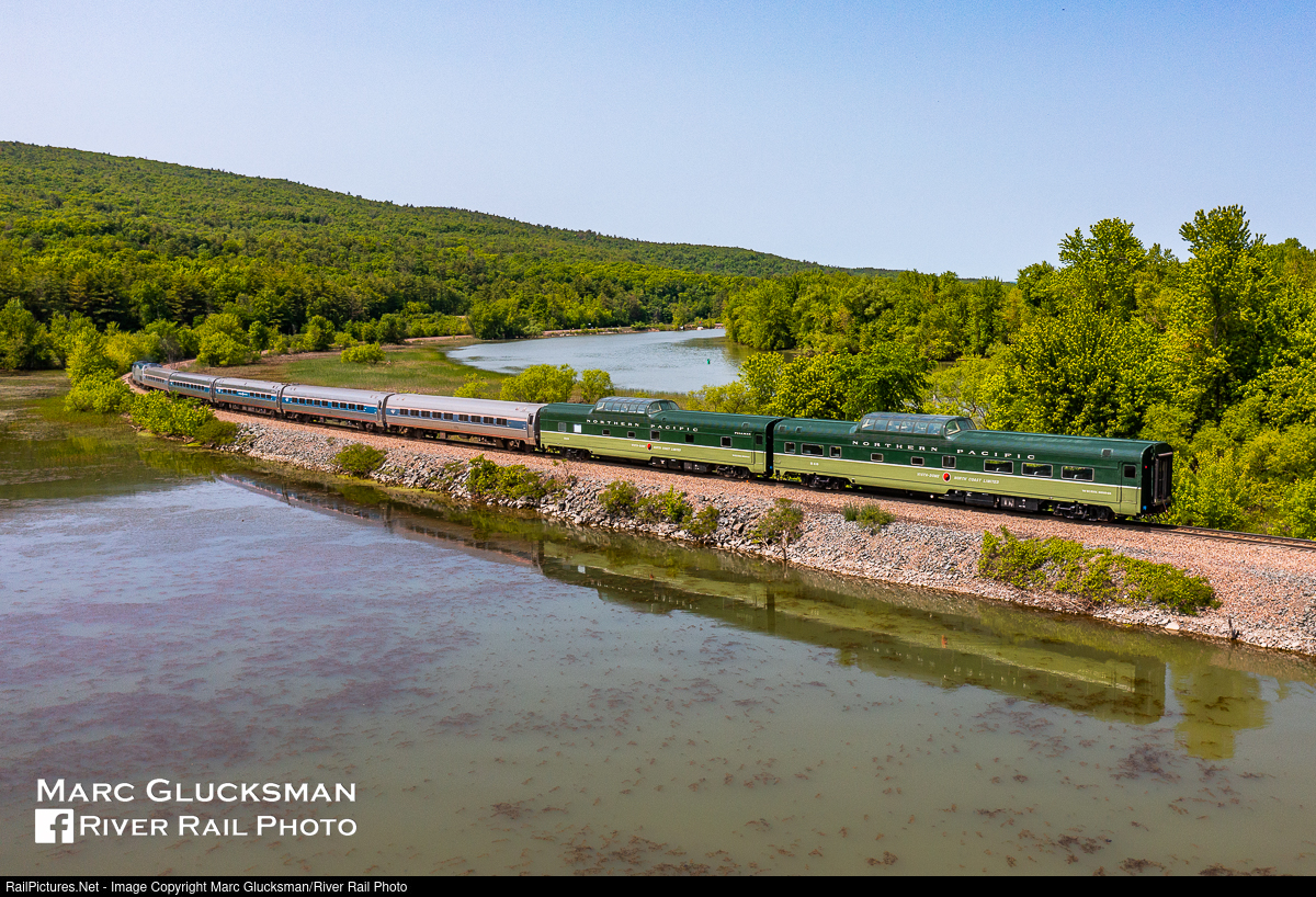 Domes To MTR. On Saturday, May 27, 2023, the first private cars to travel on the Amtrak Adirondack since its restoration post-pandemic and the first dome on this train since the Ocean View last operated in October, 2018 when Webb Rail LLC - WEBX's former Northern Pacific Railway Budd built Pullman dome/slpr 313 (WEBX 801044) and former Northern Pacific Railway Budd built dome/coach 549 (WEBX 801045) held the markers from the Albany-Rensselaer, New York station to Montreal, Quebec with AMTK 88 (P42DC) leading train 69. The train is seen passing over South Bay in Whitehall, New York. The cars have since returned and are awaiting their next adventure.