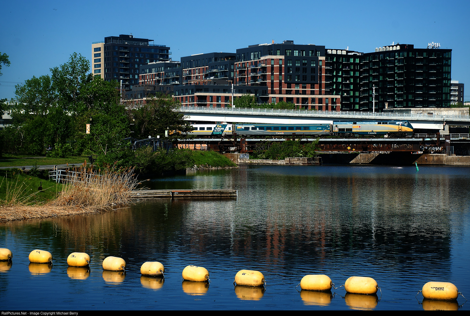 A non-wrapped P42DC pushes VIA 33 over the Lachine Canal.