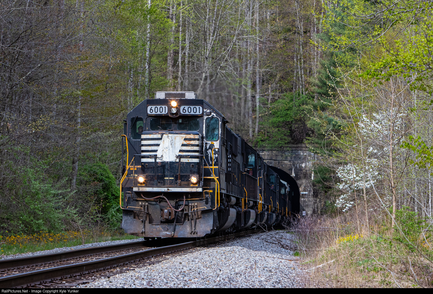 Six Kanawha River Railroad SD60's lead a pair of NS GE's and coal empties for Quincy out of Jenny Gap Tunnel
