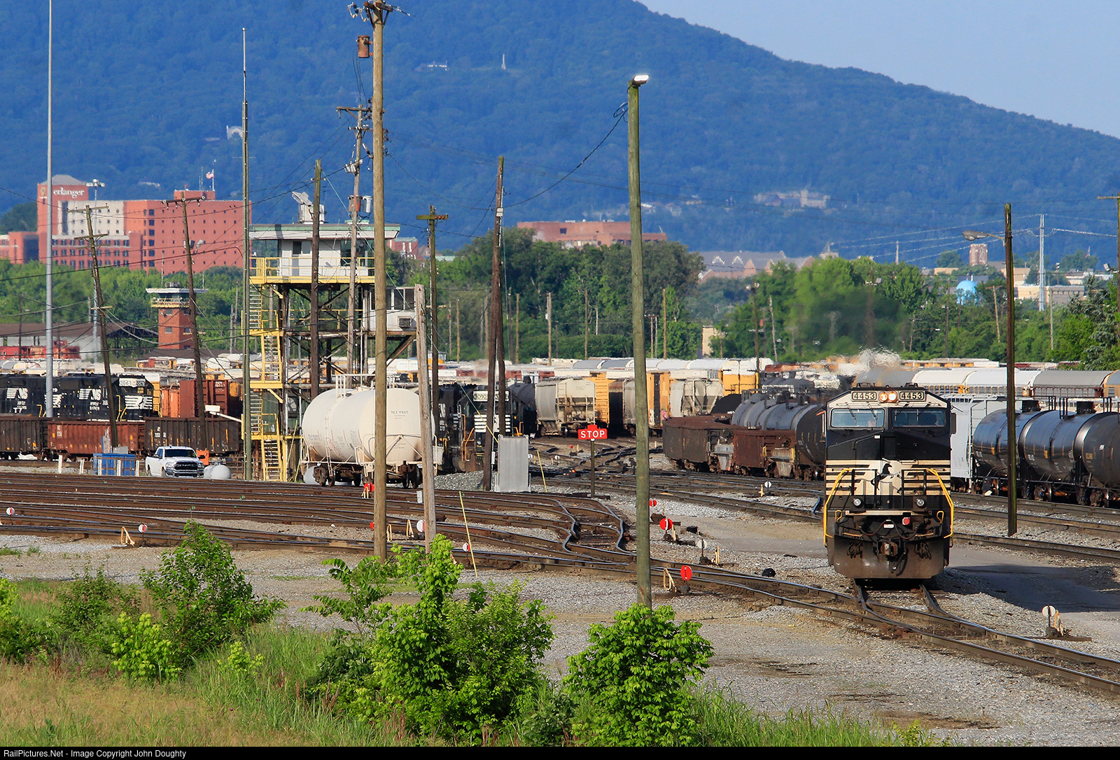 | NS 4453 leads two other engines out of the north end of the Norfolk Southern DeButts yard. In the distance are NS SD40-2 and slug units used to switch cars in the large classification yard. |