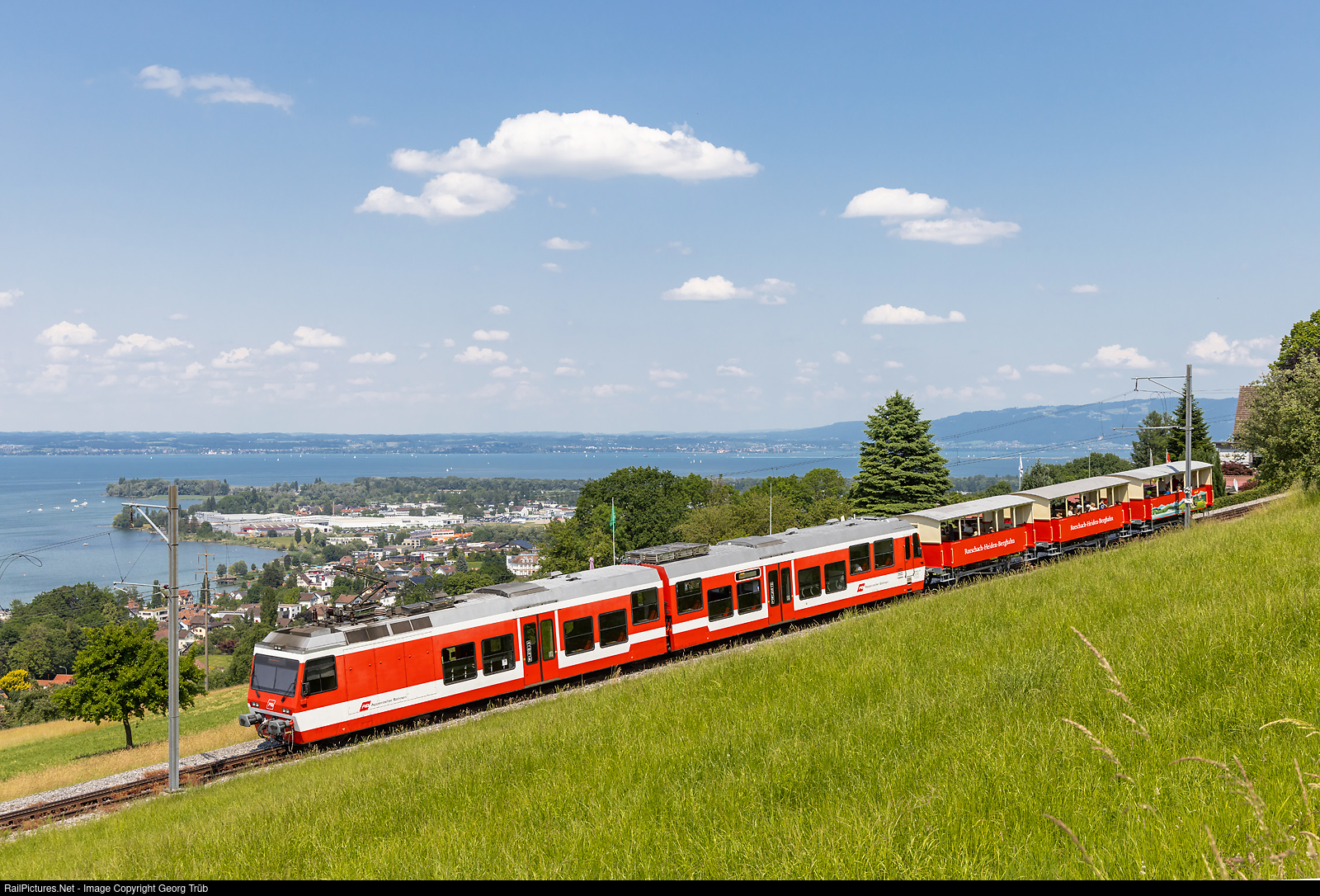 | Articulated, partly lowfloor cogwheel railcar BDeh 3/6 # 25 of the Rorschach-Heiden-Bergbahn (RHB, part of the Appenzeller Bahnen) is shoving the open observation cars B # 6, # 5 and # 4 up the mountain on a grade of about 9.0 % between Sandbüchel and Wartensee stop. In the background Lake Constance (Bodensee) and Altenrhein. The RHB is operating this open cars in summertime with each train, when the weather is good. The cars were built in 1875 and were renovated during the last winter. |