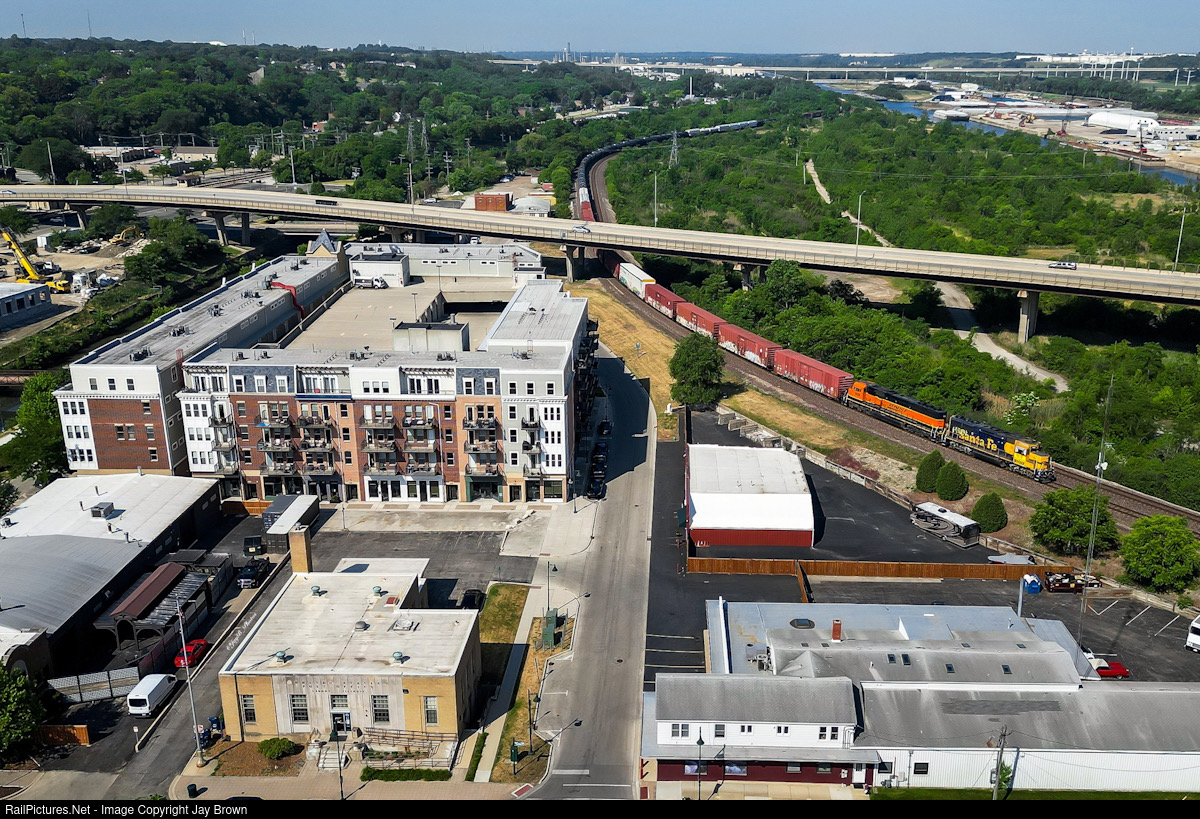 | Seen high above downtown Lemont, one of the few remaining active ATSF painted GP60s rounds through town with a long cut of manifest cars for GM yard outside Chicago. |