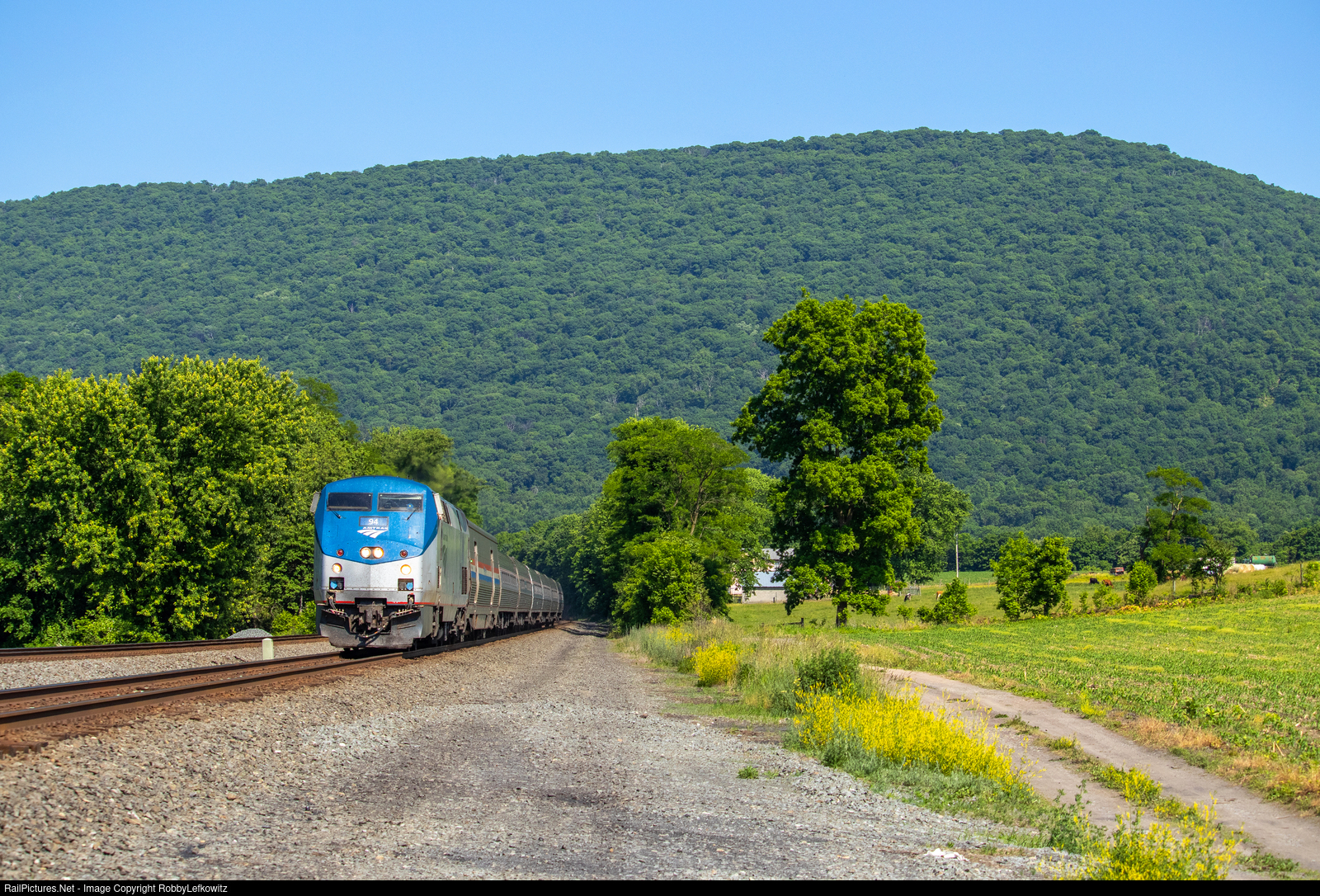 AMTK 94 leads the westbound Amtrak 43 through Horningford on the NS Pittsburgh line, as the train continues its journey in between stops at middle division stations Lewistown and Huntington. |