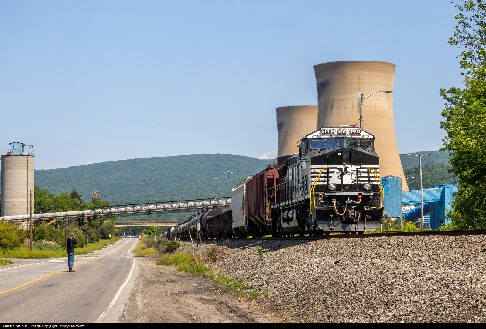 Powering Conpit: A newly released NS 4689 brings up the rear of NS 38G, as it passes the Conemaugh Generating Power Point at Conpit in New Florence, PA.