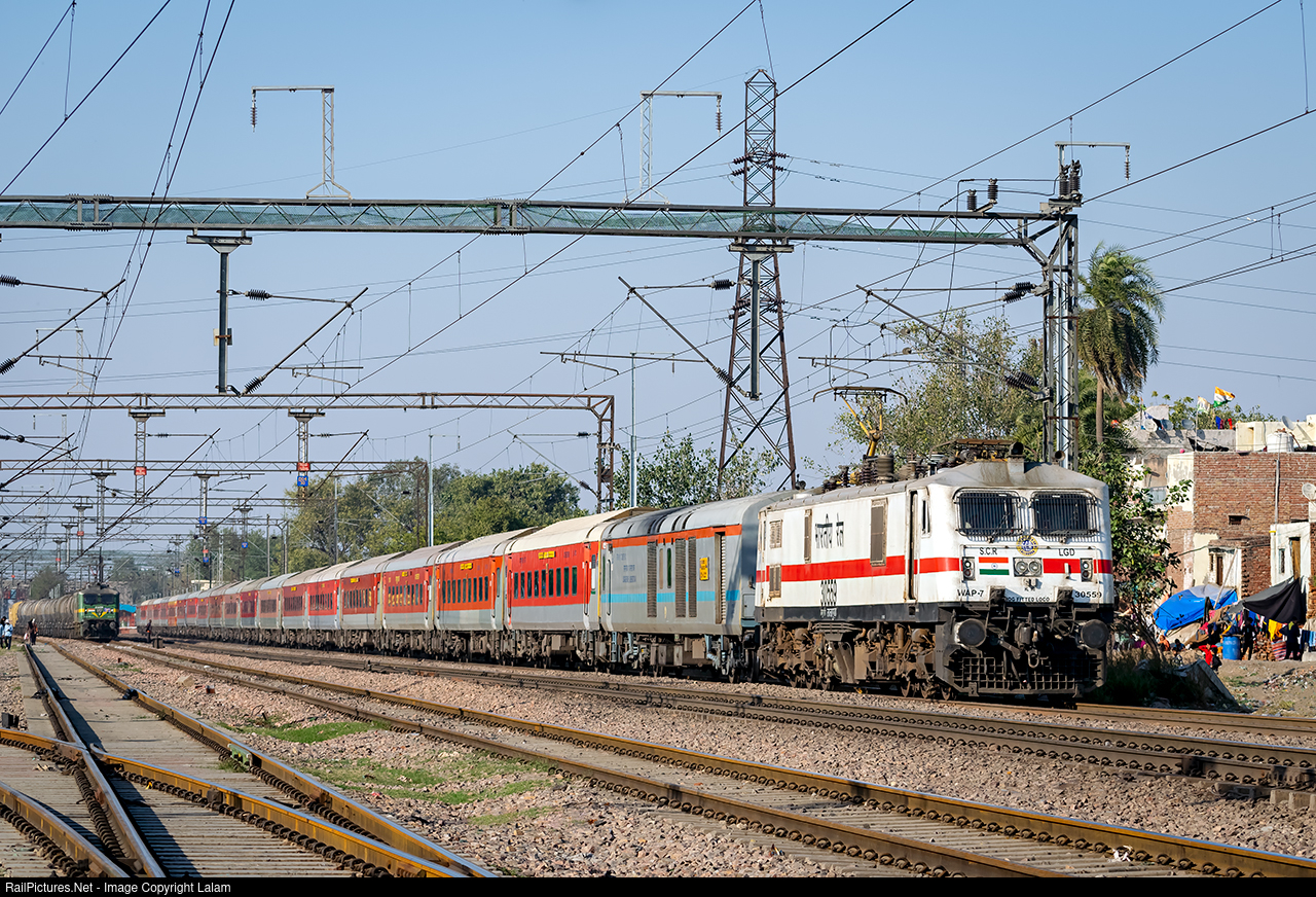 Shining with fresh coat of paint, WAP-7 locomotive hauls Nizamuddin(Delhi) to Secunderabad Rajdhani express through New Town Faridabad.