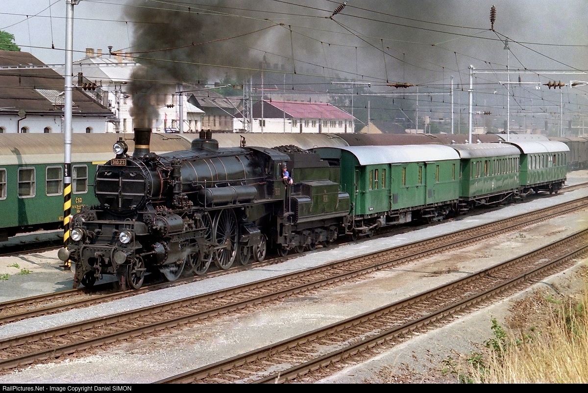 The Austrian steam locomotive 310 23 is leaving the Brno station with a passenger train. This locomotive has been designed by Karl Gölsdorf. He continually utilized the emerging technologies of the time. His Class 310 locomotive of 1911, a six-coupled express locomotive with a four-cylinder, superheated compound engine, was one of the most elegant of its day and, since the reactivation of the 310 23 in 1986, currently the most well-known product of the Austrian design engineer.