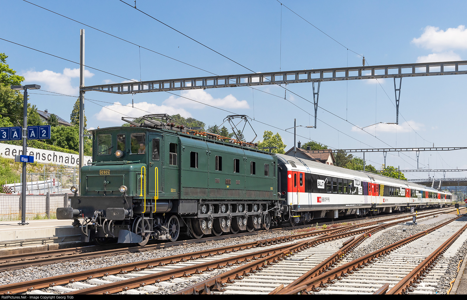 Ae 4/7 # 10905 of SBB Historic, based in Winterthur, built in 1927 by SLM and BBC for the SBB with Buchli drive, pull the "Schul- und Erlebniszug" (School and adventure train) 32052 on a transfer run from St.Gallen freight yard to Winterthur, through Elgg.