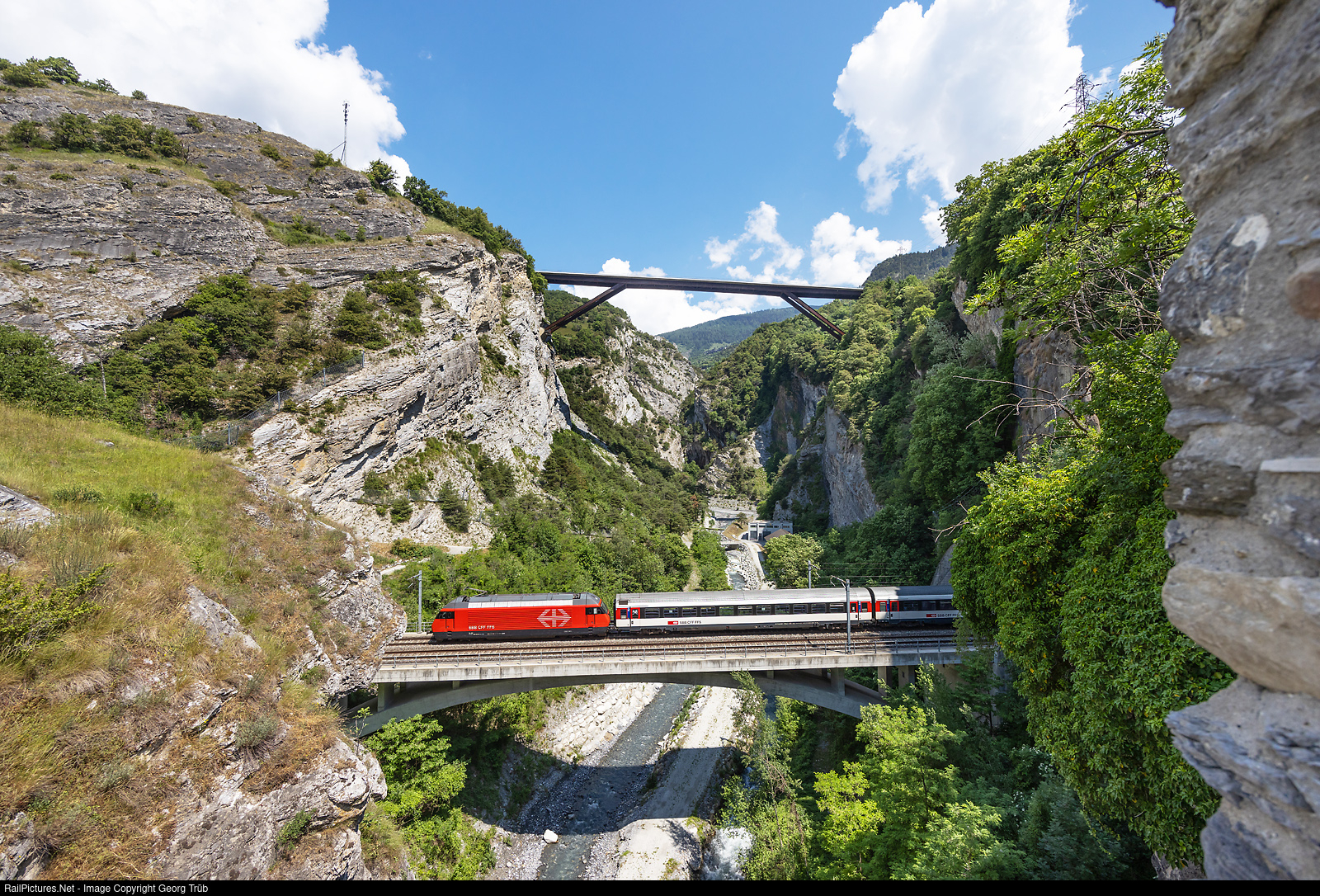 | Re 460 # 101 of the SBB shoves the Interregio 1815 of the line IR90 from Geneva Airport to Brig with 160 km/h over the 79 meter long Dala bridge between the tunnels of Varen and Leuk. Above is the 209 meter long and 130 meter high road bridge from Leuk to Varen, built in 1991. |