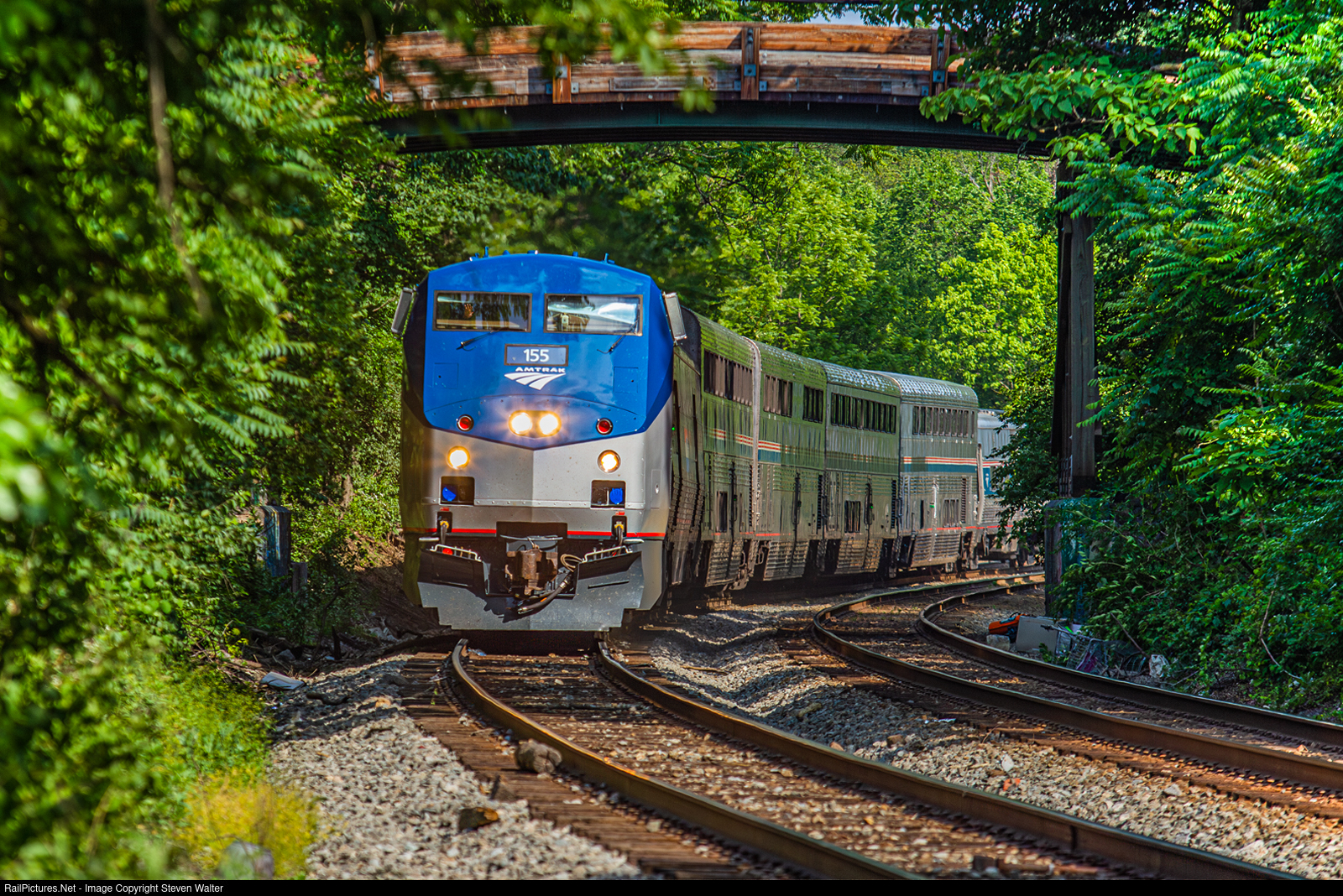 | Another Genesis refurbished out on the road again. This time Amtrak P42DC 155 leads the Capitol Limited west to Chicago under the Humpback Bridge with a wave from the engineer and American View on the rear. |