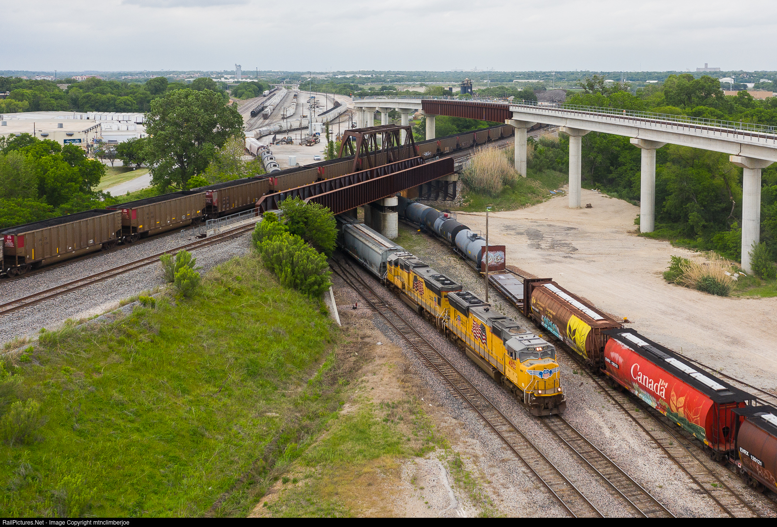| A pair of Union Pacific SD70M's work a local as they pull out of Peach Yard in Fort Worth, Texas and build their outbound train. The train is on the Duncan Subdivision, passing on the lowest level of a triple crossing of sorts with the UP Choctaw Subdivision and the TEXRail tracks passing overhead. |