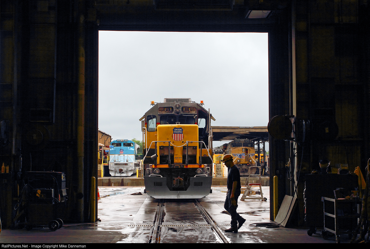 Rainy day in Arkansas Union Pacific EMD GP38-2 No. 689 is in the process of being rebuilt into a GP38N at UP’s Downing B. Jenks Shop at North Little Rock, Arkansas, on a rainy May 20, 2015. Flanking the 3361 on the left is famous UP EMD SD70ACe No 4141, specially-painted and dedicated to the George Bush 41 Presidential Library and Museum that also led his funeral train, and on the right is run-of-the-mill UP GE ES44AC No. 5295.