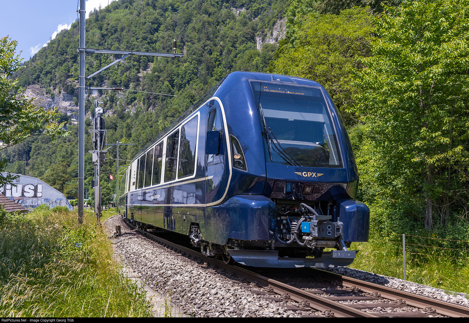 At the timetable change in December 2022, the Goldenpass Express (GPX) started with a first train pair on the Interlaken East-Montreux line, a joint product of MOB and BLS with a direct train that can be re-gauged. From Interlaken Ost via Spiez to Zweisimmen, the train runs on standard gauge (1435 mm), continuing on meter gauge via Gstaad to Montreux. But at the end of February 2023, BLS prohibited further operation on the standard gauge section, as unacceptable wear was found on various switch frogs, which could be traced back to the new vehicles. After extensive test runs and a correction of the wheel spacing (the bogies do not have continuous axles but single wheels), service could be resumed on June 11, initially with a daily train pair starting at Montreux in the morning. Train PE 4068 from Montreux to Interlaken Ost is reaching destination with leading cab car ABst # 384 and not visible Re 465 # 002 of the BLS in the rear. The carbodies were built by StadlerRail, designed by Pininfarina, the gauge changeable bogies built by Alstom.