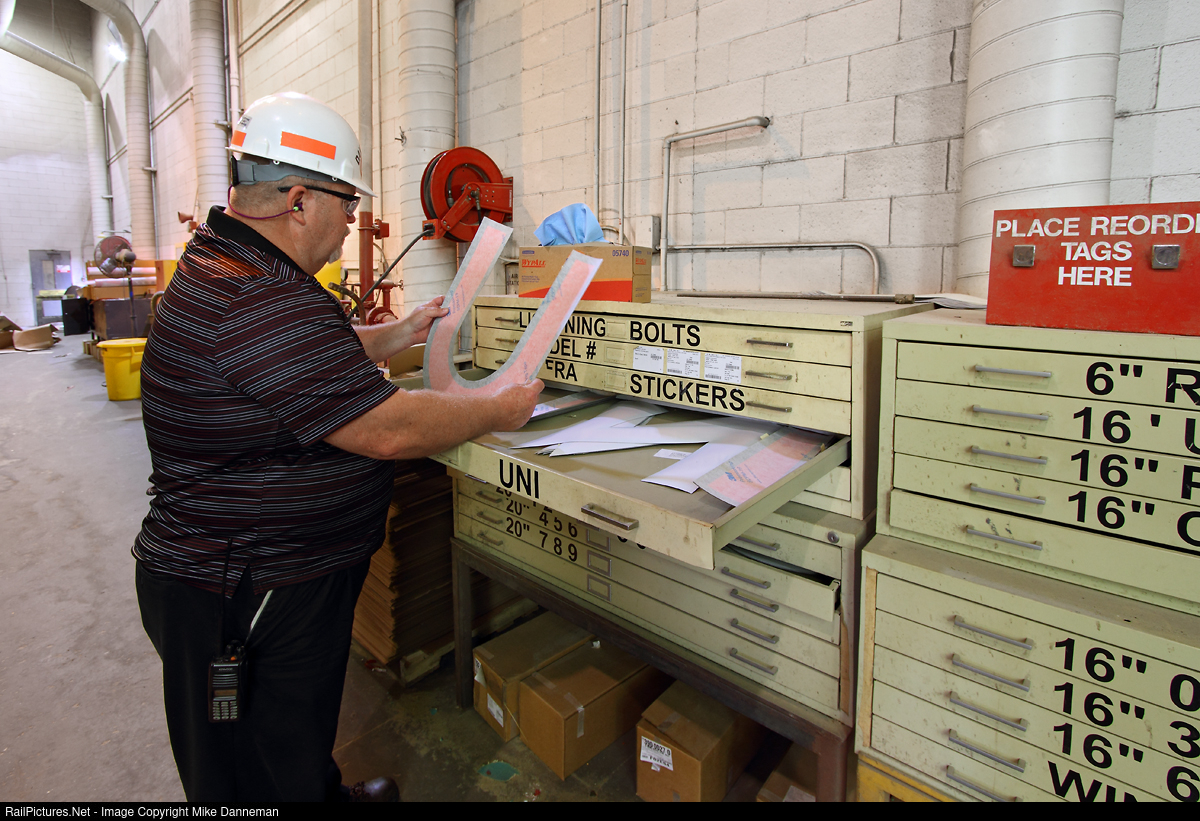 First shift paint shop supervisor David Smith takes inventory of the Scotchlite Union Pacific lettering used on the sides of locomotives that aren’t adorned with the large flags, such as hood units, on May 18, 2015. It’s always good to make sure one doesn’t run out of a certain letter or number that would hold up a locomotive paint job from completion.