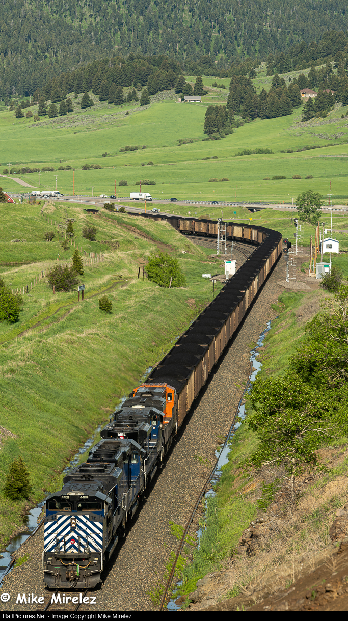 MRL 4400 helps a loaded coal train down the westside of Bozeman Pass