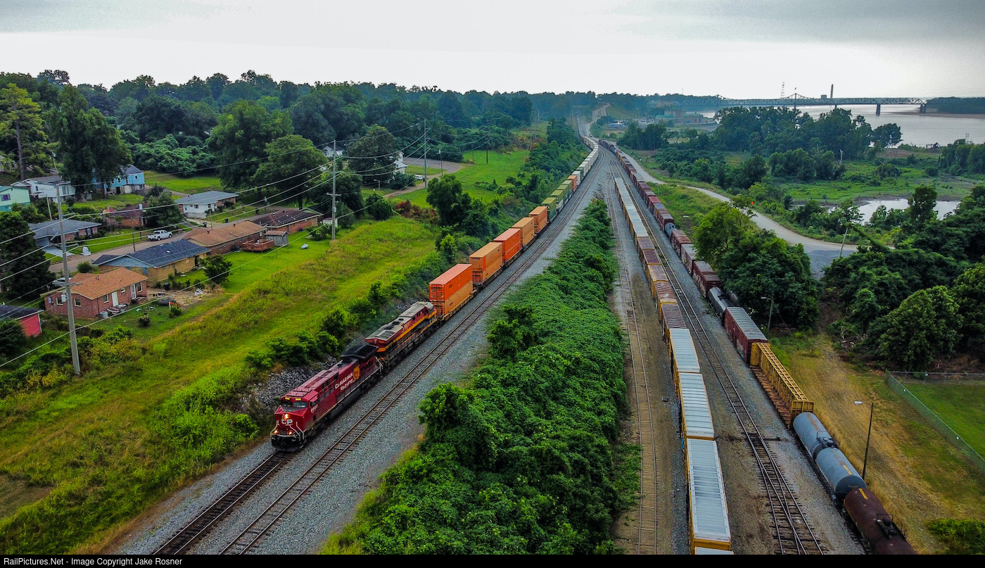 | CPKC M168 wastes no time getting past the Vicksburg yard, with a CP/KCS lashup, CP 8000 leading the way. |
