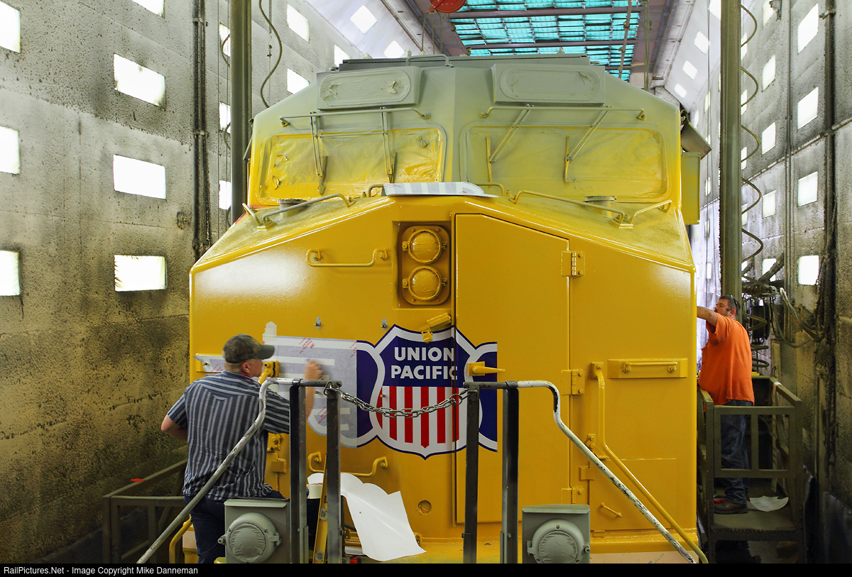 On May 18, 2015, Union Pacific GE ES44AC No. 5401 gets repainted and lettered at the railroad’s Downing B. Jenks Shop in North Little Rock, Arkansas. Gary Dunlap, a carman by trade, is applying the winged nose logo, while another painter is putting on the numbers to the side of the cab. These large Scotchlite wings comes in three pieces that have to be skillfully fitted around the nose door and other obstructions on these locomotives.