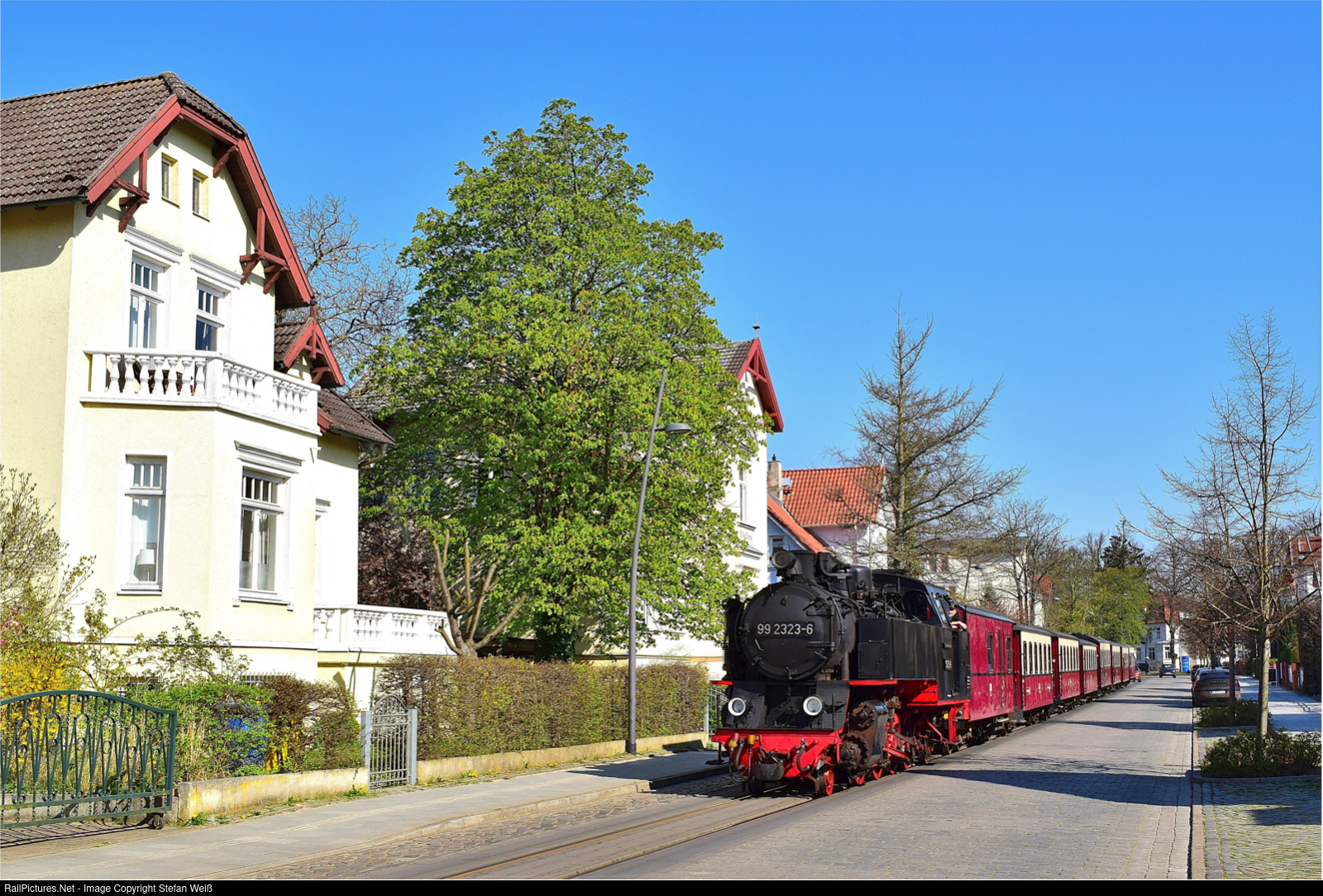 | Coming from Kuehlungsborn, the 99 2323-6 reached Goethestraße in Bad Doberan on the morning of April 22, 2023, where the chestnut tree at Villa Clara was already shining in the fresh green. |