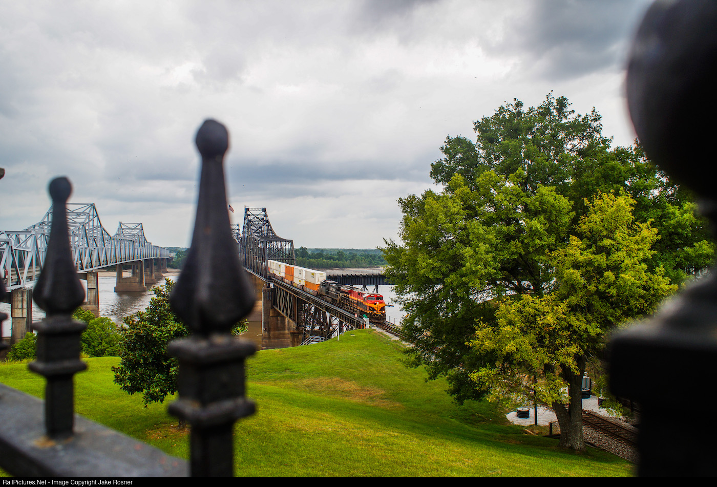 CPKC M168 slowly crawls over the Mississippi river in Vicksburg, with KCS 5021 leading a Norfolk Southern AC44C6M.