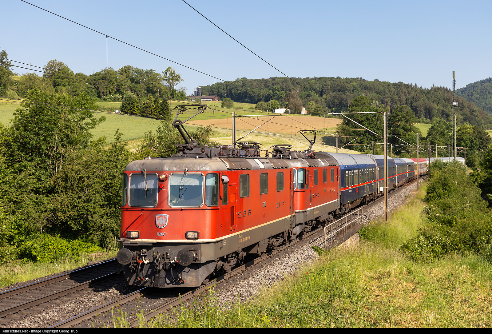 | Re 420 # 200 and # 195 (Re 4/4 II # 11200 and # 11195) of the SBB in multiple control pull the EuroNight EN 471 from Hamburg Altona to Zürich, on the Bözberg north ramp between Hornussen and Effingen. |