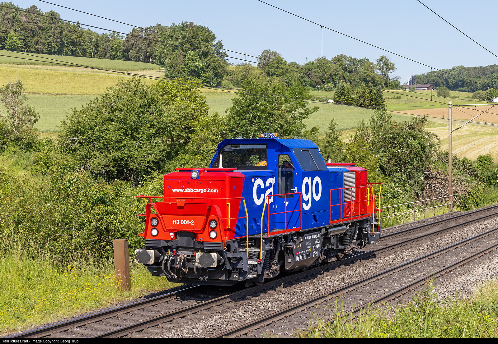 | Hybrid diesel and battery locomotive Ama 832 # 001 of SBB Cargo is running as train 38030 from Limmattal shunting yard (RBL) to Basel shunting yard on the Bözberg north ramp between Effingen and Hornussen. SBB Cargo has leased 12 of these three-axle "Prima H3" locomotives from LokRoll 2 AG Finanzierungsgesellschaft for 10 years, they were built by Alstom in Stendal/Germany. |