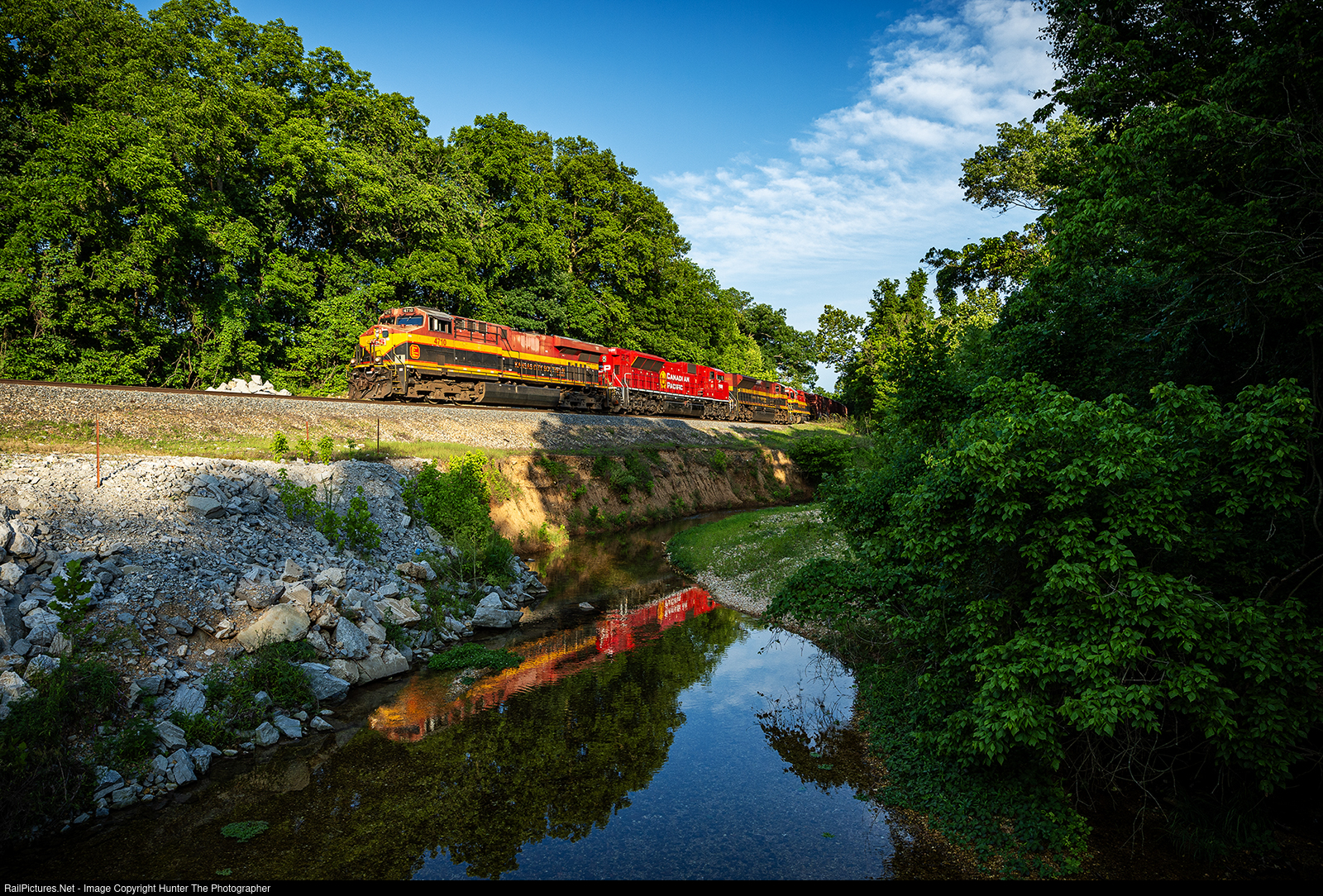Late Afternoon in Late Spring | Late in the afternoon on a hot Thursday, June 15, 2023, northbound manifest train M261 cruises alongside Wolf Creek a couple of miles south of Gravette, AR. Having met a southbound grain train a little while ago at Gentry, this manifest train has now just cruised through the signals at North Dorsey.