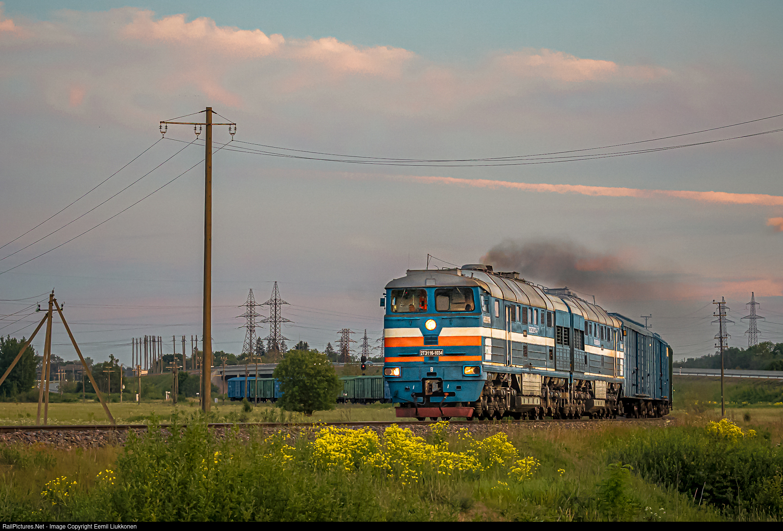 Sun is setting behind the horizon in the fields of Estonia. For a brief moment the increasing silence of nigh is interrupted by freight train coming from Southern Estonia hauled by the massive Soviet diesel locomotive 2TE116.