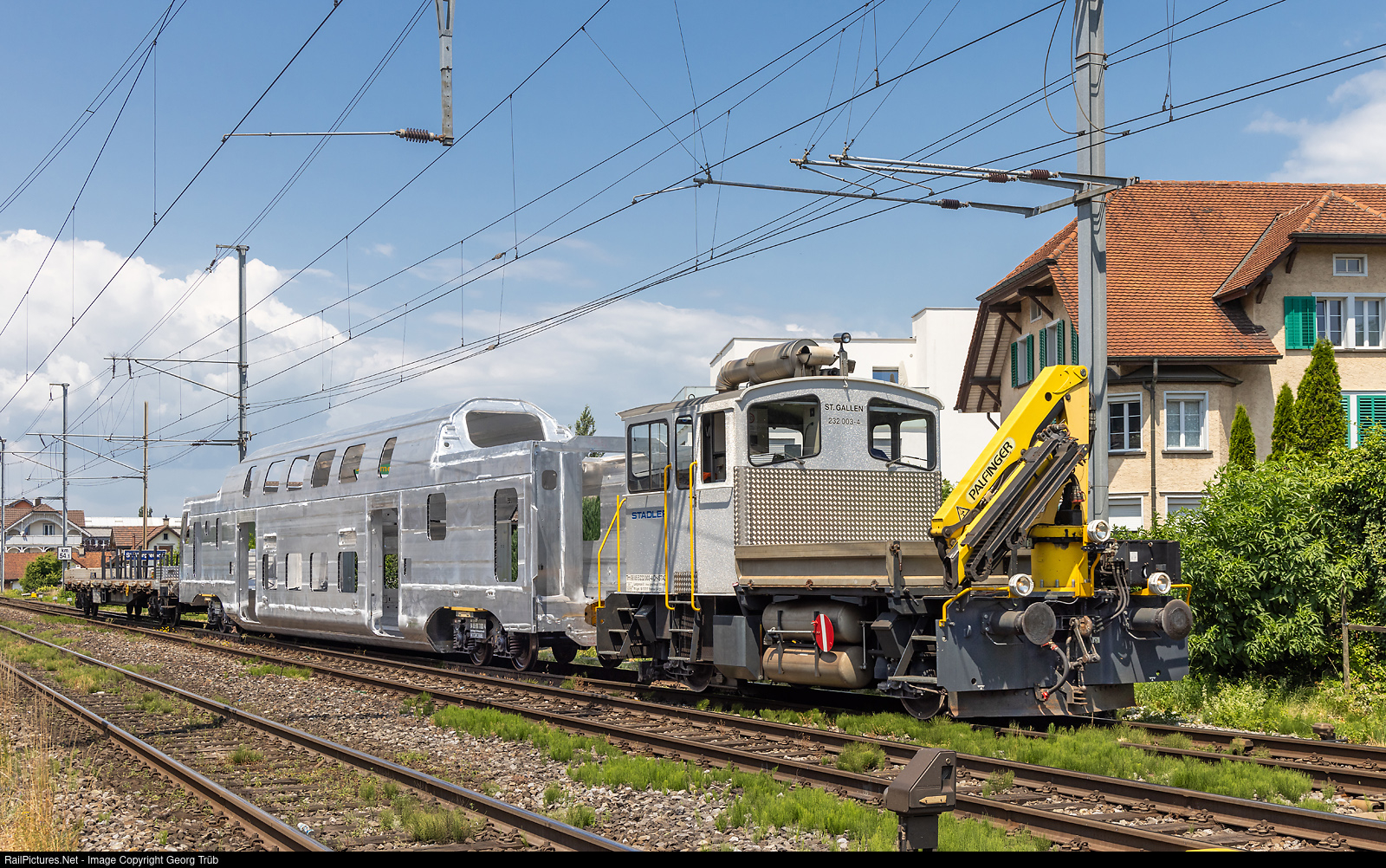 Small diesel locomotive Tm 232 # 003 of StadlerRail is entering St.Margrethen with train 69229 from Altenrhein, pulling a aluminium raw carbody (end car) for a SBB RABe 512 (Interregio Doubledeck train) on special transport bogies. The driving vehicle is connected to the aluminum carbody via a yellow coupling rod, and a four-axle freight car runs behind it that is also coupled in this way. For this order alone for 60 RABe 512 trains, 360 such car bodies are currently being welded together in Altenrhein and then transported to St. Margrethen. In St.Margrethen is the large new plant of StadlerRail for the building of doubledeck trains, but the aluminium carbodies are still built in the Altenrhein plant (former Flug-und Fahrzeugwerke Altenrhein FFA, then Schindler Waggon Altenrhein SWA). The Altenrhein plant has a siding to the SBB main line between Staad and Rheineck, the St.Margrethen plant is connected to the St.Margrethen station, the transport distance is about 9 kilometers. The journeys take place under the own railroad company STAG.
