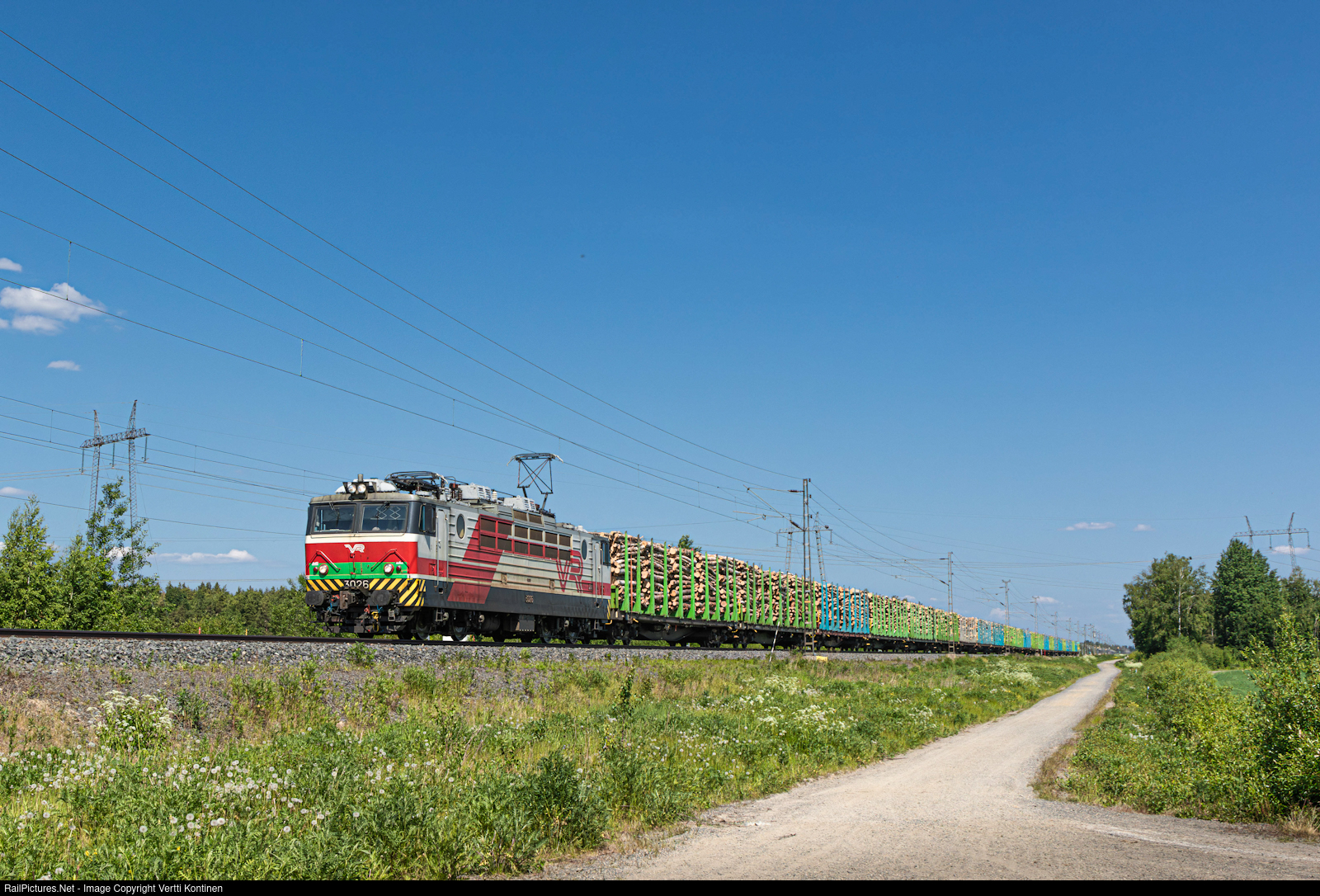 VR class Sr1 electric number 3026 pulling a loaded timber train southbound on the finnish mainline