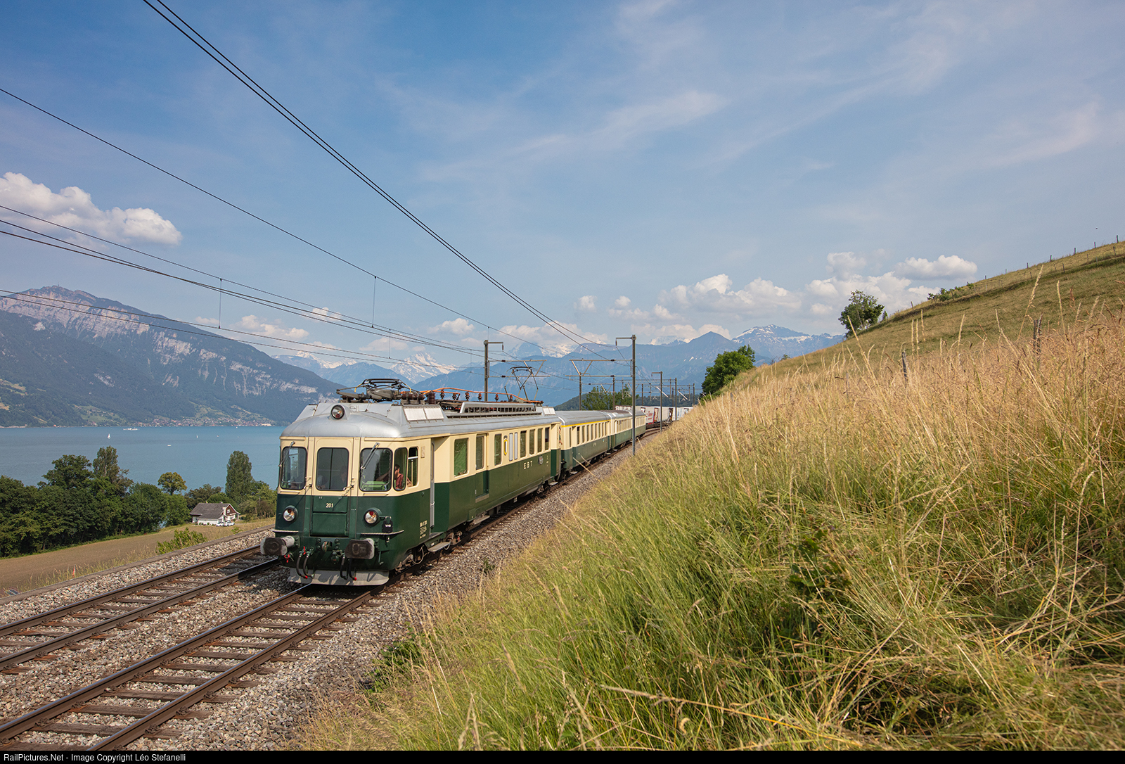 | Charter train of the Verein Pendelzug Mirage (VPM) with railcar BDe 4/4 # 201, from Brig to Zell LU, between Spiez and Thun. |