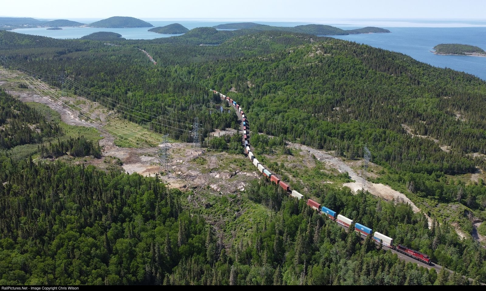Eastbound stacks head east along the Heron Bay Sub at Angler with the town of Marathon off in the distance. The various islands and bays of Peninsula Harbour are visable.
