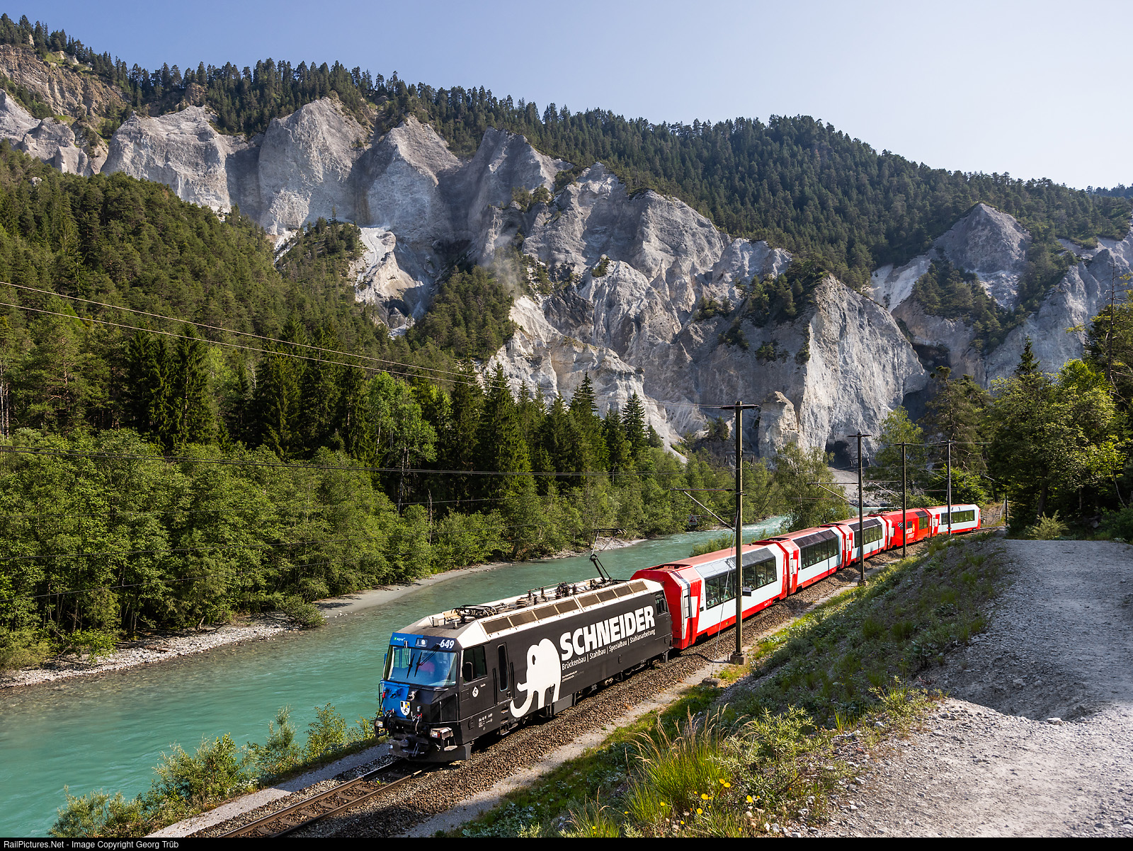 | The GLACIER EXPRESS trains are usually pulled on the Rhaetian Railway network by locomotives of the Ge 4/4 II series. Sometimes Ge 4/4 III are in charge, like today. Ge 4/4 III # 649 in the blue/black "Schneider/Jörimann" publicity paint scheme pulls the PE 901 St.Moritz-Brig on the lap between Chur and Disentis/Mustér, running through the gorge of the Vorderrhein between Versam-Safien and Valendas-Sagogn. |