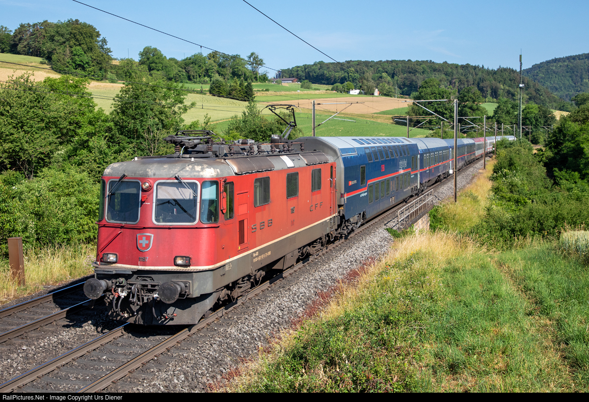 | The SBB locomotive Re 420 197 is pulling NightJet 471 from Hamburg Altona (Germany) to Zürich HB on the Bözberg north ramp.