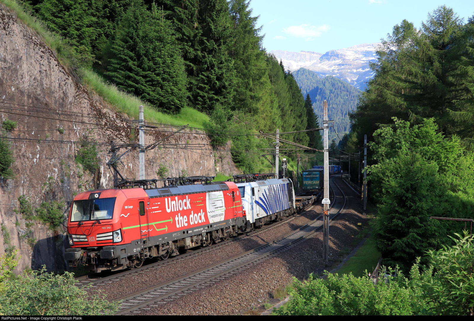 | The austrian flora at its best, DB Cargo 193 342 "Unlock the Dock" & Lokomotion 189 914 coming down from the borderstation Brenner/Brennero with an intermodal train to continue its journey to the Inn valley and destination Germany |