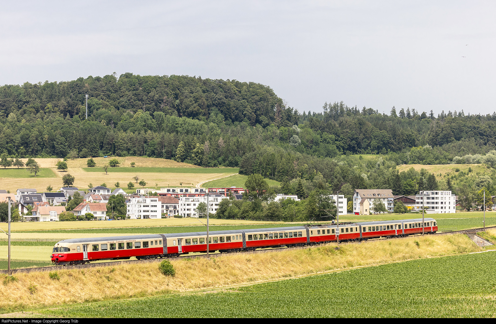 | SBB Historic's timelessly elegant iconic TRANS EUROP EXPRESS RAe TEE II # 1053 was designed and built in 1961 at the Schweizerische Industriegesellschaft (SIG) in Neuhausen near Schaffhausen, with electrical equipment for the 4 power systems of Europe by MFO. The SIG company, which today no longer manufactures railroad vehicles but is active in packaging machine construction, is celebrating its 170th anniversary this year. On this occasion, the train with invited guests ran from Zurich Seebach via Bülach-Eglisau to the stop Neuhausen Rheinfall and further as an empty train to Schaffhausen. The 6-car train has just left Rafz and is heading for Lottstetten. |