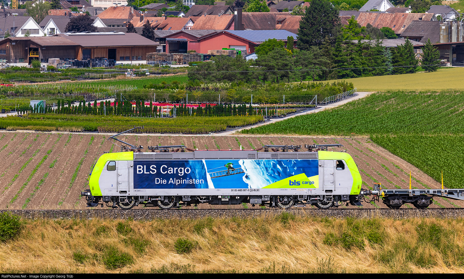 | Bombardier TRAXX F140 AC1 Re 485 # 007 of the BLS Cargo, in service for 20 years already, pulls the freight train 48676 from Singen (Hohentwiel)/Germany via Schaffhausen-Bülach-Regensdorf-Bözberg to Basel shunting yard, between Lottstetten and Rafz. The load were 16 empty flat cars of type Rs of the french ERMEWA SA company. |