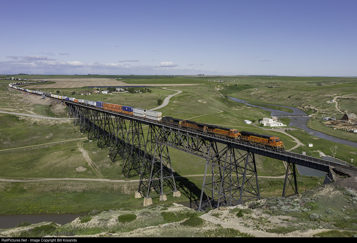 A high priority eastbound train makes its way across Cutbank Creek on the BNSF Hi-Line. There was a high wind warning this day. Of course, the first thing I did was launch my drone...