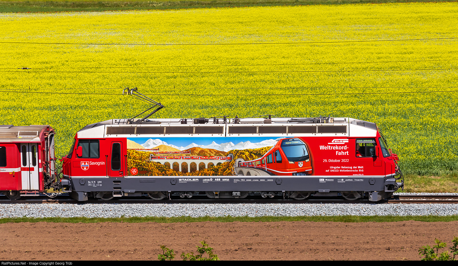 | Ge 4/4 III # 644 "Savognin" of the Rhaetian Railway has a publicity paint scheme for the world record of the longest passenger train, and is pulling the IR 1153 from Chur to St.Moritz between Reichenau-Tamins and Bonaduz. In july 2022 the insciption was "Weltrekord-Versuch" (world record attempt) and when the goal was achieved on october 29th, 2022, the inscription was altered to "Weltrekord-Fahrt" (world record run). |