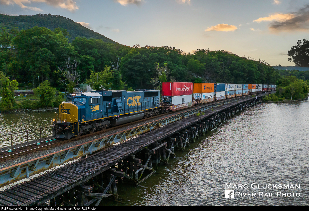 Welcome To Summer. It was very fortunate that it happened to be the longest light day of the year when CSX I004-20 (Bedford Park, IL-South Kearny, NJ) crossed Doodletown Bight near Bear Mountain, New York on Wednesday, June 21, 2023. Solo leader CSXT 4588 (SD70AC/MACe rebuild, née-CR 4143, SD70MAC, EMD, 5/1998) is an usual leader for an intermodal train, and had it arrived at well after 8:00 PM in January like it did on this day, it would have been dark for several hours already.
