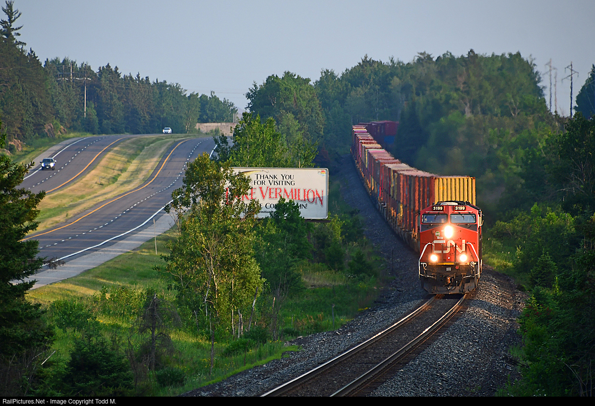 The longest day of the year at 2000 hrs. finds container train Q199 led by CN 3199 climbing the south side of the Laurentian Divide approaching m.p. 78 on the CN Rainy Sub as they head for the border crossing at Ranier, MN.