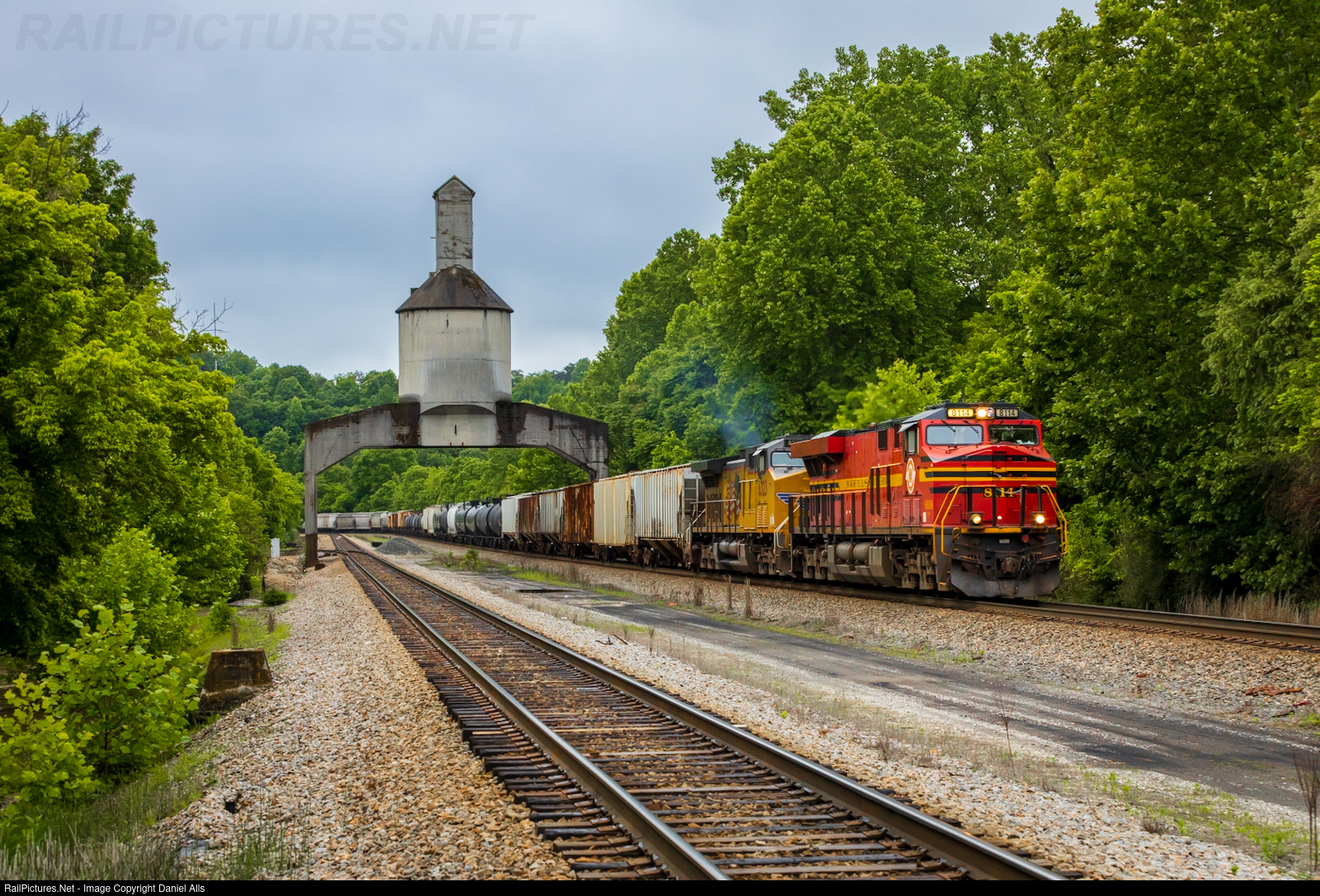 | The original NS heritage unit leads 18M east under the old coaling tower in Vicker, VA on the Christiansburg district. |