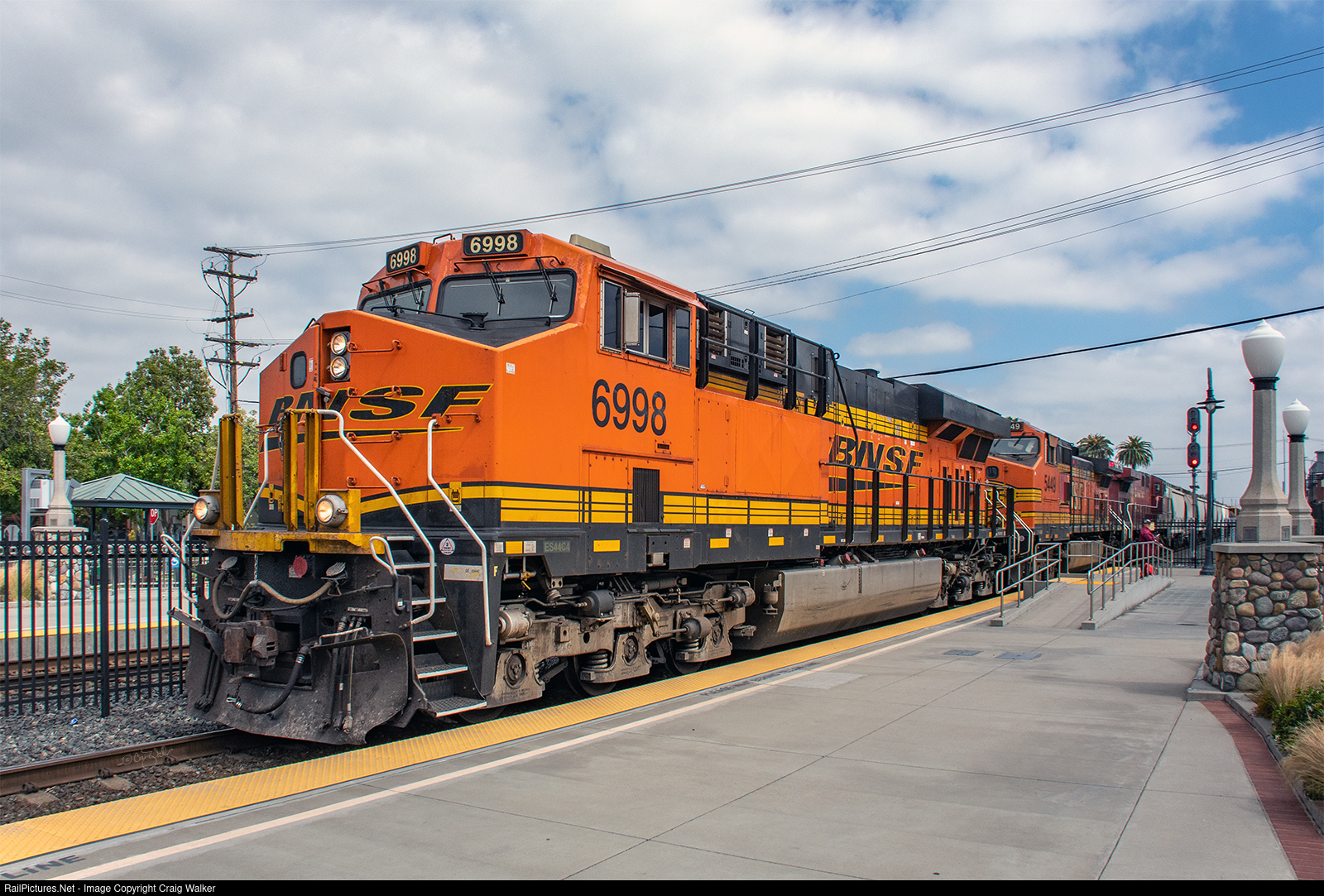 While the old Santa Fe "Surf Line", now Metrolink's Orange Sub, is closed to passenger traffic in San Clemente due to yet another landslide, freight trains are still allowed to pass by as this is the only rail access to San Diego. (The freights crawl by at no more than 10 mph, however.) On this second day of summer, BNSF Railway train H-BARSDG rolls through the Metrolink station in Orange, with BNSF ES44C4 6998, BNSF Dash 9-44CW 5449 and Canadian Pacific AC4400CW 8621 up front (and CP AC4400CWM 8154 as this train's rear Distributed Power Unit). This train passed through here at 10:30 am, after the last morning Metrolink train operated on this line, and hours before the first of the afternoon fleet begins operating. (And Amtrak service on this line has been reduced as well, thanks to that landslide.) Other than the restricted speed along the beach in San Clemente, this train will have an unimpeded run to San Diego from Barstow. (Orange, California – June 22, 2023)