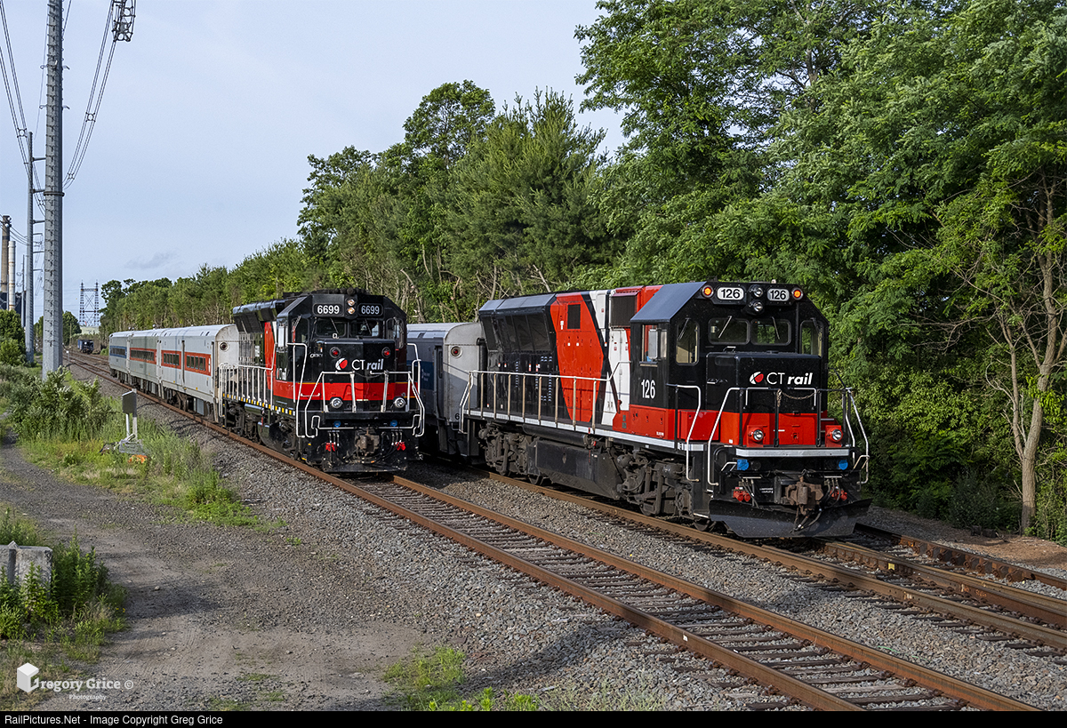 On the morning of June 21st, 2023, Connecticut Department of Transportation (CTDOT)/CTrail EMD GP40-3H 6699 sits on the point of a Metro-North train 1902 as it holds Track 2 at CP 502 on the Waterbury Branch in Milford, Connecticut. Passing on Track 1 is train 1935, which is being shoved by CTDOT Brookville BL20GHM 126. The 6699 is on lease to Metro-North to assist with fleet size while the remainder of their Brookville BL20GHs are sent out for rebuild.