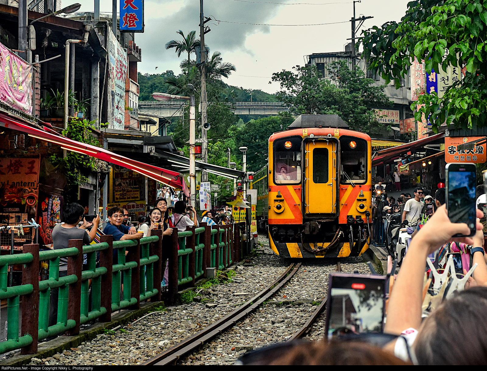 | Spectators gather around the track as an afternoon commuter train makes its way through Shifen Old Street. To my knowledge, this is the only sort of frequent "street running" operation in Taiwan. This part of the line includes dramatic scenery and a glimpse of history as the train passes by abandoned gold mines, temples, and waterfalls. |