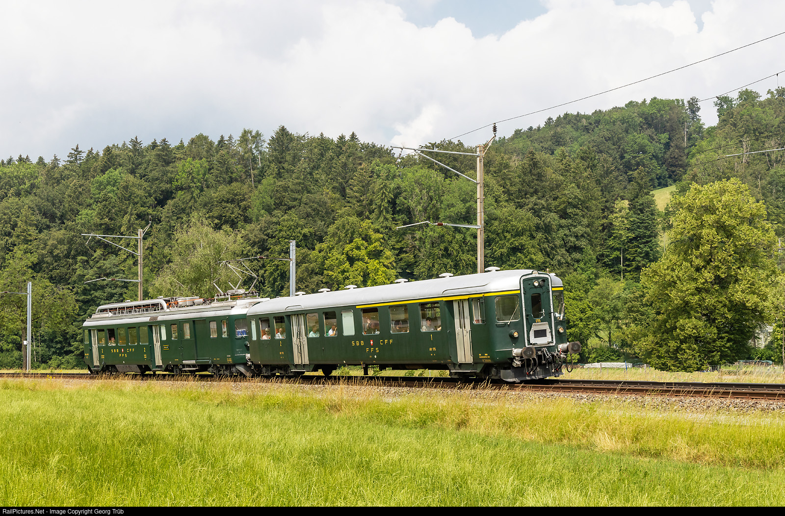 The "Wyländerli" push-pull train of SBB Historic, group Winterthur, with cab car ABt # 1715 and railcar BDe 4/4 (designated as BFe 4/4) # 1643, is on a charter journey through the Töss valley, from Sennhof-Kyburg via Bauma to Rapperswil, between Rikon and Rämismühle-Zell. In earlier decades, this trains were the standard on this line, usually with a intermediate car second class B.