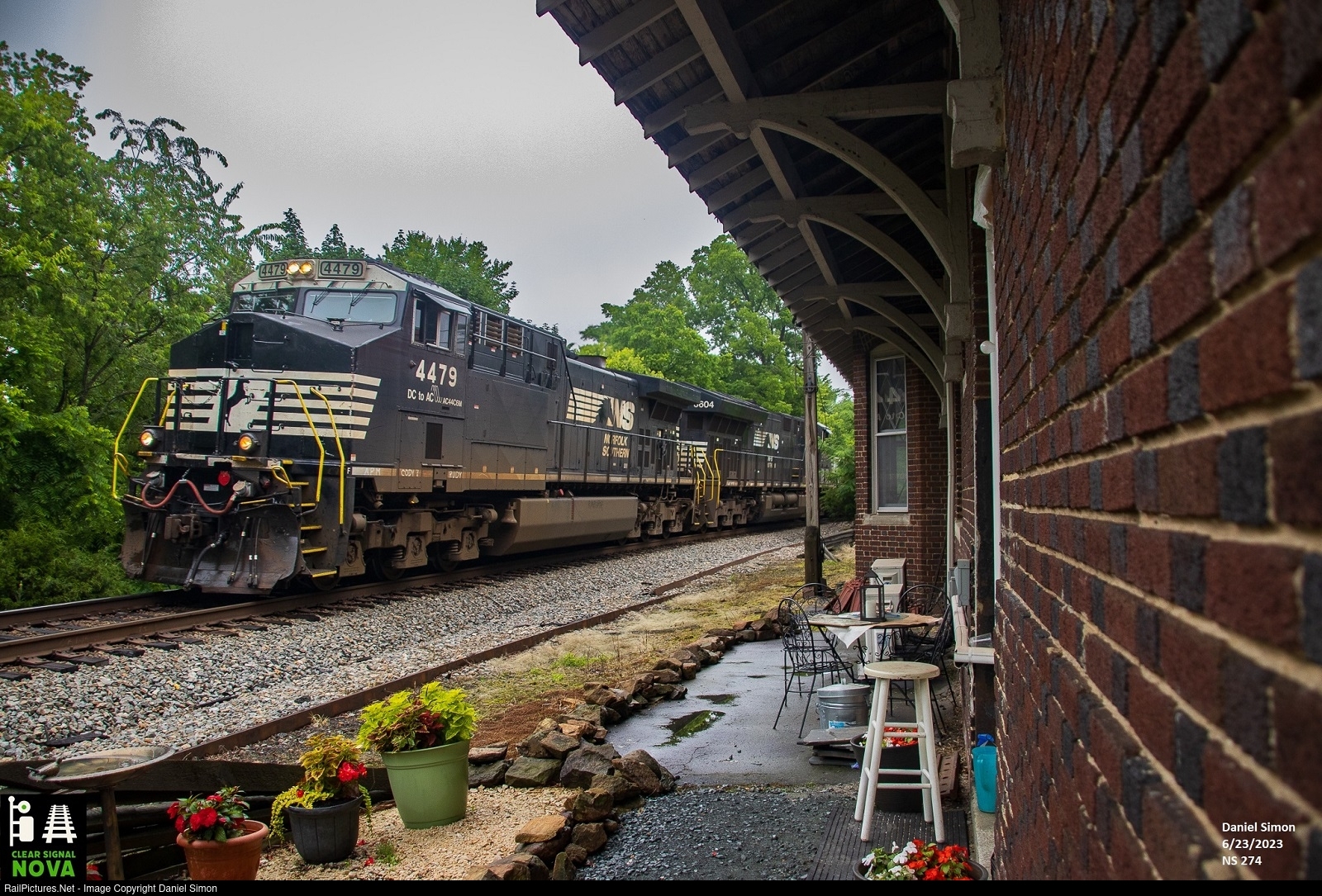 | It's a muggy, dreary June morning on the Norfolk Southern B-Line. NS Train 274 comes rolling by the old passenger depot in town. |