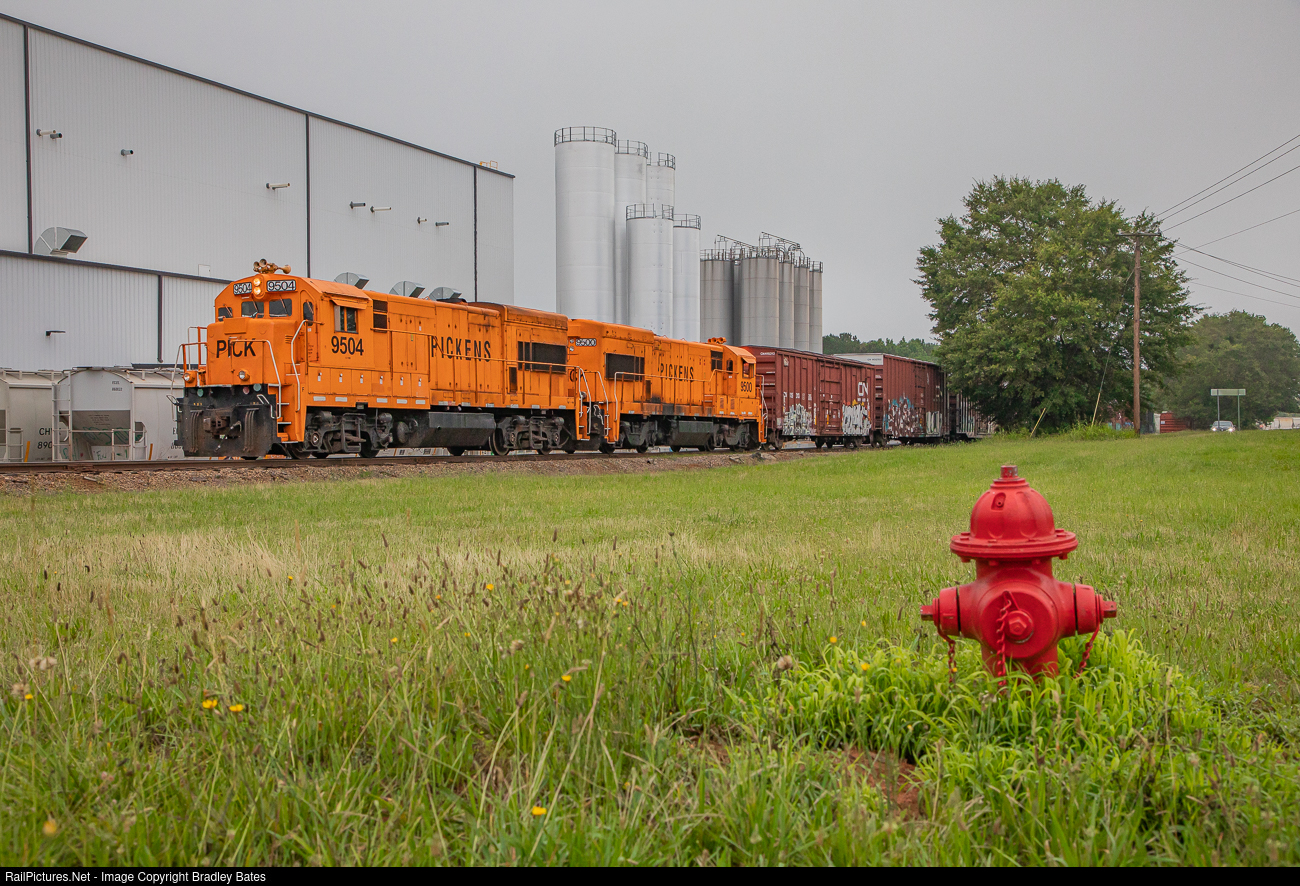 | It's a muggy summer morning on the Pickens Railroad in Gluck, SC., as U18B's #9504 & #9500 get a Train ready to head for Belton to interchange with the Greenville & Western Railway. |