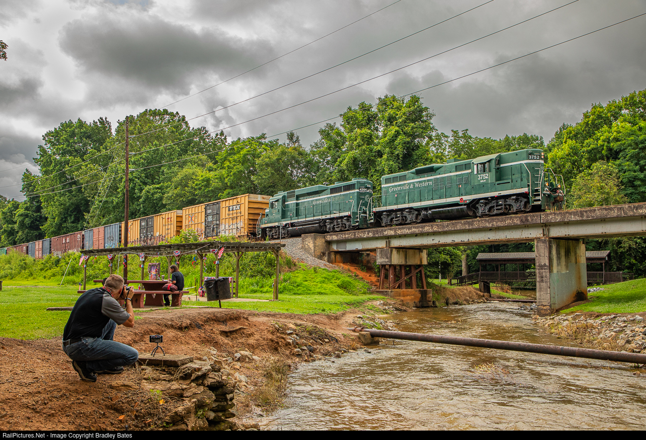 GRLW GP9 High Hood #3752 leads a Greenville & Western Freight Train southbound across Big Creek in Williamston, SC., as they head to Belton to interchange with the Pickens Railroad. Norfolk Southern Locomotive Engineer David Light can be seen getting a photo as well in the bottom left corner of this image.