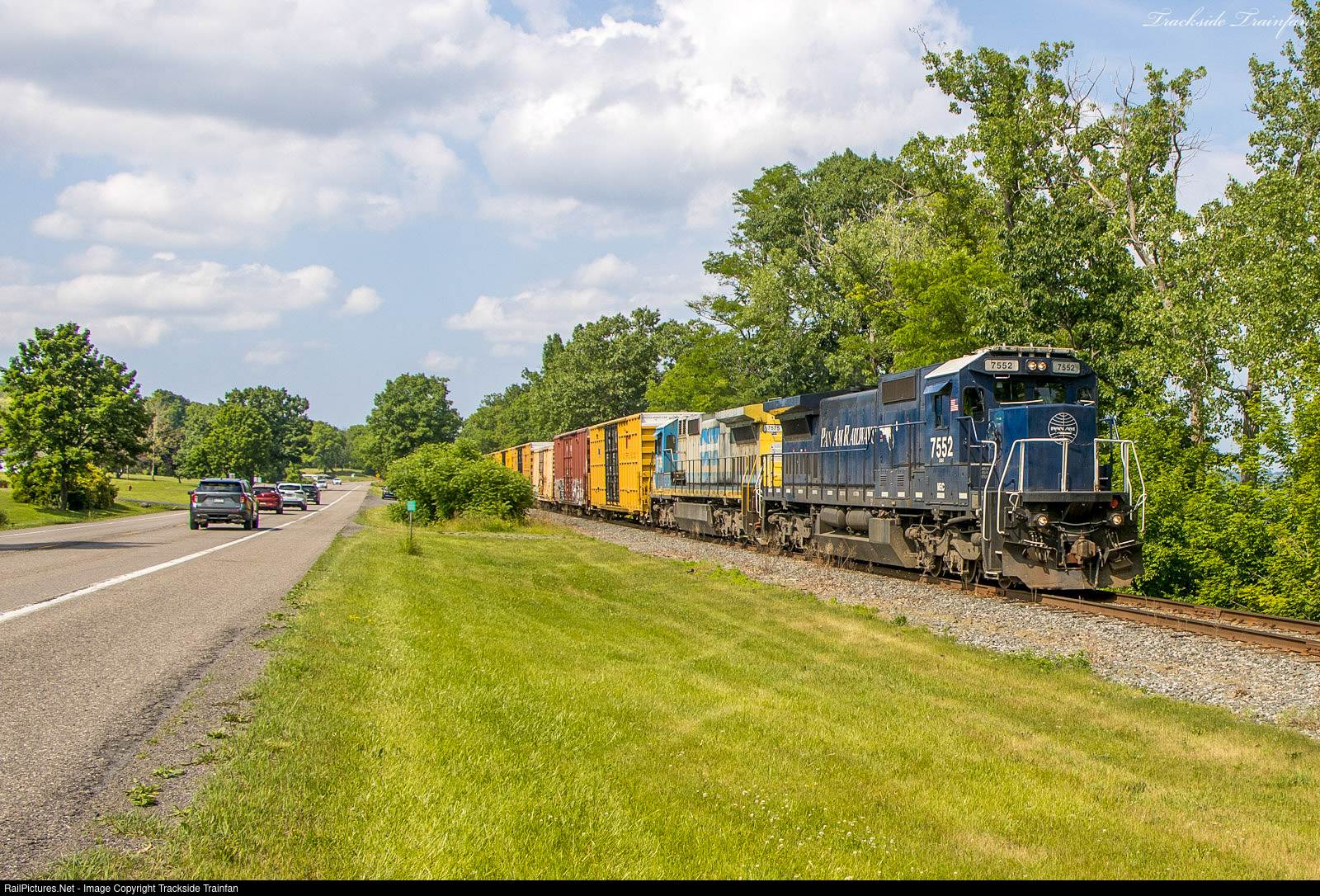 | NS HO6-18 has 2 Pan Am units numbered MEC 7552, 7575 headed Southbound along Route 14 in Geneva NY bound for Gang Mills NY 6-18-23. |