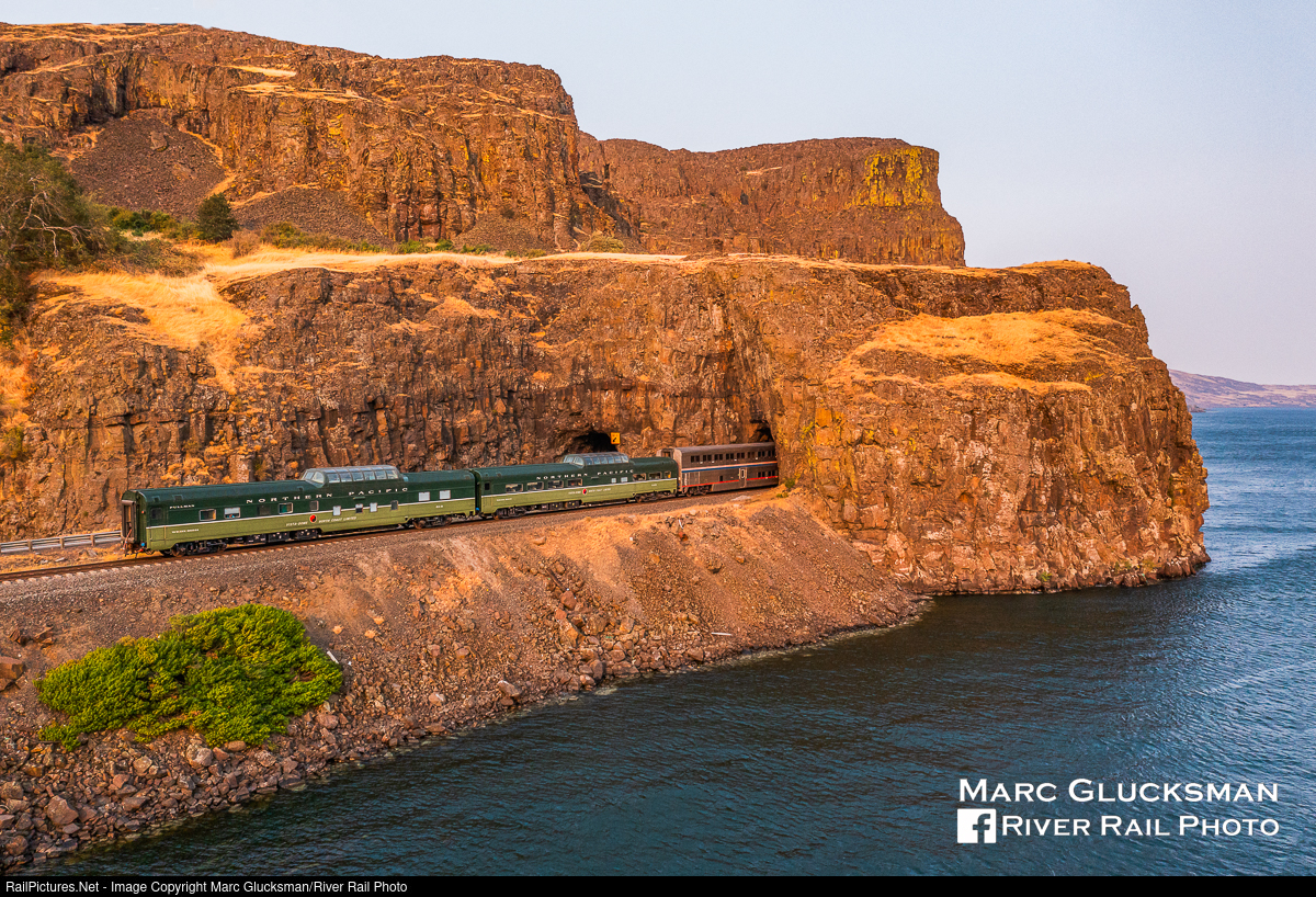 Swallowed Up By The Cliffs. On Tuesday August 3, 2021, Webb Rail's former Northern Pacific Railway Budd built Pullman dome/slpr 313 (WEBX 801044) former Northern Pacific Railway Budd built dome/coach 549 (WEBX 801045) held the markers on Amtrak Train 28 (Empire Builder) in Lyle, Washington as the train traveled parallel to the Lewis and Clark Highway and the Columbia River, seen entering a deceptively small tunnel in between Lyle and Smithville. This area of the route of the "Builder" includes a number of bridges, tunnels and other scenery. The cars made a quick turn with the consist in Portland, Oregon, having arrived on Train 27 only a few hours prior.